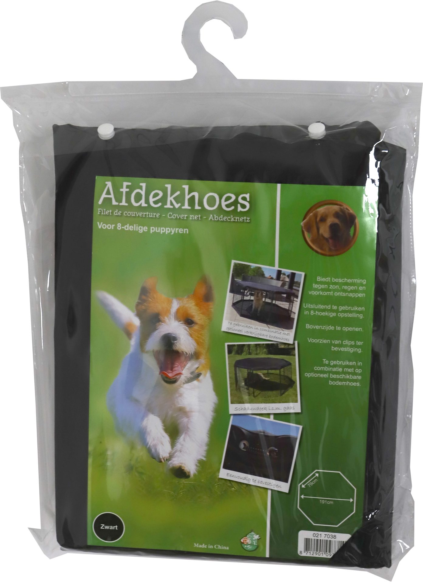 Deze afdekhoes kan worden gebruikt in combinatie met de met de 8 delige puppyren. Deze hoes beschermt uw dier tegen zon, regen of andere factoren wanneer de ren buiten wordt gebruikt. De helft van deze afdekhoes heeft een zonwerend gedeelte, waardoor uw pup altijd voldoende schaduw heeft wanneer hij of zij daar behoefte aan heeft. De hoes wordt geleverd met stevige elastieken die het mogelijk maakt deze hoes perfect strak te monteren voor een uiterst stijlvolle uitstraling. In het gedeelte waar de deur zit kan een flap omhog worden geklapt, zodat de deur moeiteloos open en dichtkan terwijl de hoes gemonteerd zit. De hoes kan worden gebruikt voor alle drie de maten puppyrennen.