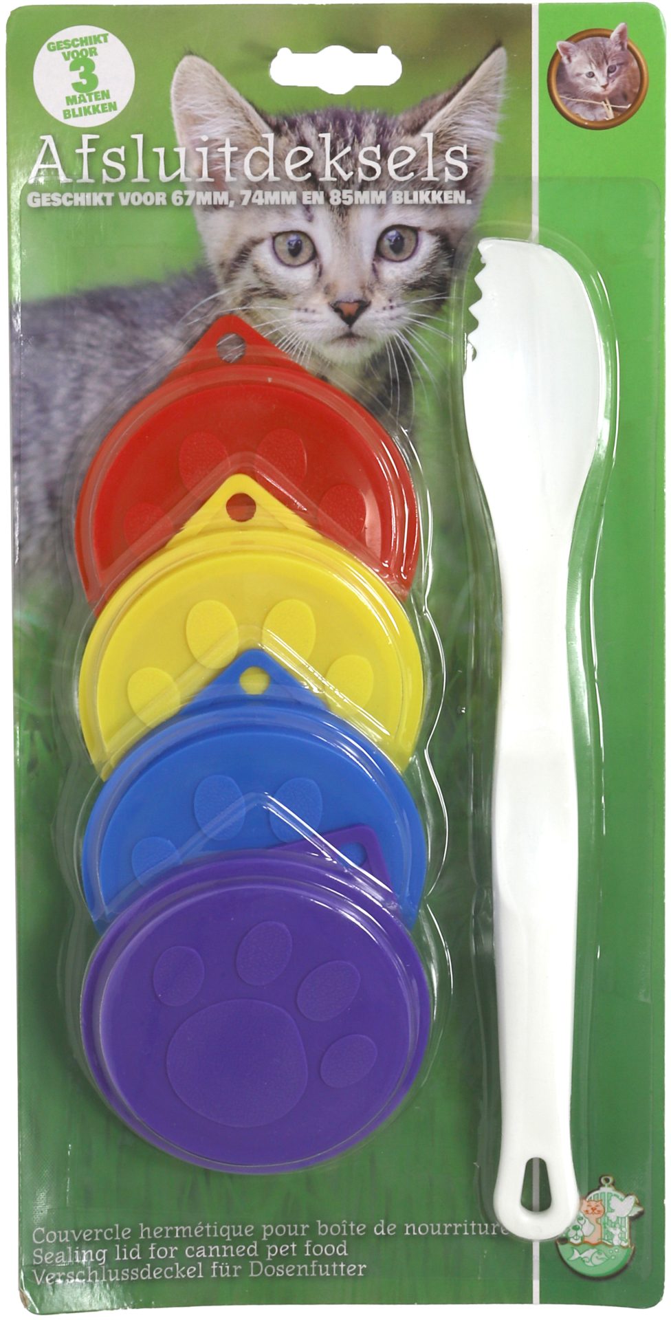 Maak het voeren van je kat eenvoudiger met deze praktische set van 4 afsluitdeksels en voerschep! De set bevat universele afsluitdeksels die perfect passen op blikjes met een diameter van 67mm, 74mm en 85mm, zodat natvoer langer vers blijft en nare geurtjes worden verminderd. De handige voerschep maakt het scheppen gemakkelijk, terwijl de kartelrand helpt om natvoer moeiteloos klein te maken.