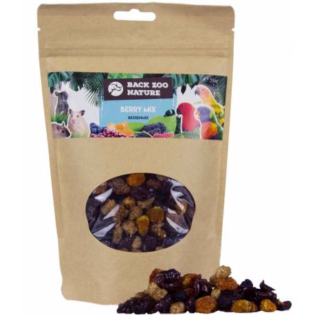 Back Zoo Nature Bessen Mix 200 gram Een unieke mengeling voor knaagdieren en kromsnavels zoals parkieten en papegaaien. De Bessenmix van Back Zoo Nature bestaat uit Veenbessen, Incabessen, Moerbeibessen en Blauwe bessen. Een unieke mengeling van bessen welke erg in trek is bij papegaaien en andere dieren. Een belangrijk onderdeel van het dieet voor vogels en knaagdieren is, naast zaden, de aanvulling van fruit, noten, groenten, bloemen en insecten. Veel zadenmengelingen zijn niet voorzien van deze belangrijke voedingselementen. Deze unieke lijn van Back Zoo Nature is een mooie aanvulling op de voeding van jouw vogel of knaagdier. Welke zowel als aanvulling en verrijking van het dieet gegeven kunnen worden, of als snack, beloning of afwisseling. In de natuur dienen dieren echt op zoek te gaan naar hun voedsel. Vogels en knaagdieren zijn er uren per dag mee bezig en moeten echt hun best ervoor doen. Zorg dat je jouw vogel of knaagdier ook stimuleert in het natuurlijke foerageer gedrag. Biedt het eten niet altijd in een kant-en-klaar bakje aan, maar verstop het, of laat ze er voor werken of puzzelen. Zorg dus voor uitdaging en afwisseling, dit kan bijvoorbeeld ook door middel van foerageerspeelgoed. Vooral dingen om te slopen en knagen om ergens bij te kunnen zijn vaak in trek bij vogels en knaagdieren. Deze Bessen Mix van Back Zoo Nature zijn van hoge kwaliteit, speciaal voor vogels en knaagdieren. De Back Zoo Nature Bessen Mix zijn op verschillende manieren te gebruiken, om door het voer heen te mengen voor een completer dieet, of als snack of beloning. Heeft jouw parkiet, papegaai of knaagdier de Bessen Mix van Back Zoo Nature al eens geprobeerd? Bestaande uit verschillende soorten bessen in een mix!