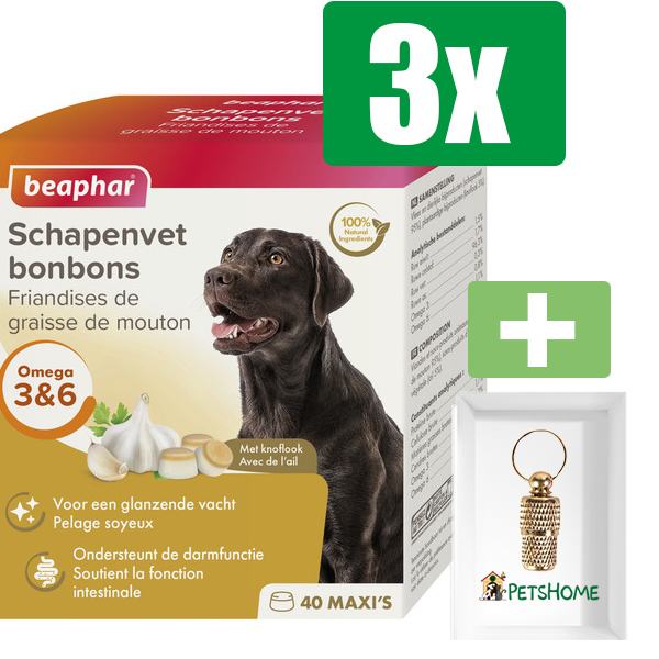 Beaphar Schapenvetbonbons Knoflook Medium 245 gram – 3 Stuks – Inclusief PetsHome Goudkleurige Adreskoker