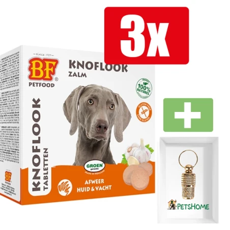 De smaakvolle en koud geperste knoflook tabletten van BF Petfood (voorheen Biofood) met zalmaroma, knoflook, aminozuren, vitaminen (A, B, D en E) en mineralen ondersteunen de huid en darmflora. Uit onderzoek is gebleken dat knoflook werkt als insectwerend middel. Onderzoeksresultaten tonen significante vermindering van tekenbeten bij het consumeren van knoflook. Het gist in de tabletten bevat naast vitamine B(-complex) en vitamine D ook hoogwaardige aminozuren, mineralen, eiwit en enzymen. Aanvullend diervoeder voor alle hondenrassen, van pup tot senior.