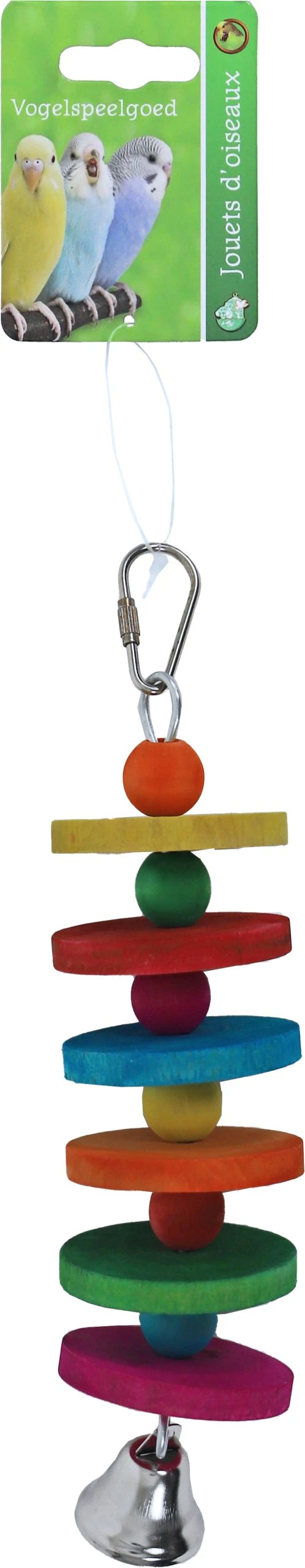 Boon vogelspeelgoed gemaakt van houten ballen en cirkels. De ballen en cirkels vormen een soort ladder waarmee uw vogel goed kan spelen. Product wordt geleverd met een metalen bel en is voorzien van een metalen ophangsysteem dat op slot kan. Totale lengte is 21 cm.