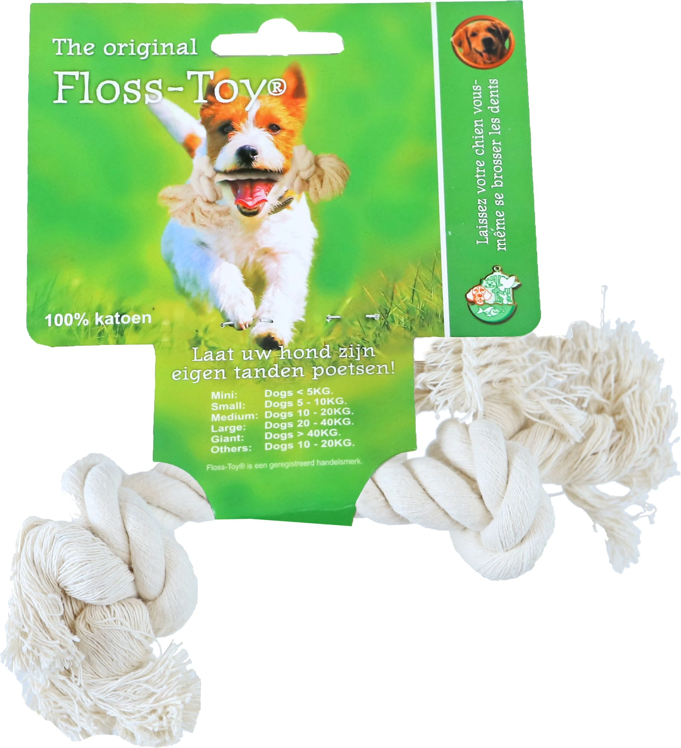 Elke hond kan nu zelf zijn tanden poetsen. De Floss-toy reinigt spelenderwijs het gebit. Niet alleen de oppervlakte, maar ook tussen de tanden. Iedere hond is er dol op!
