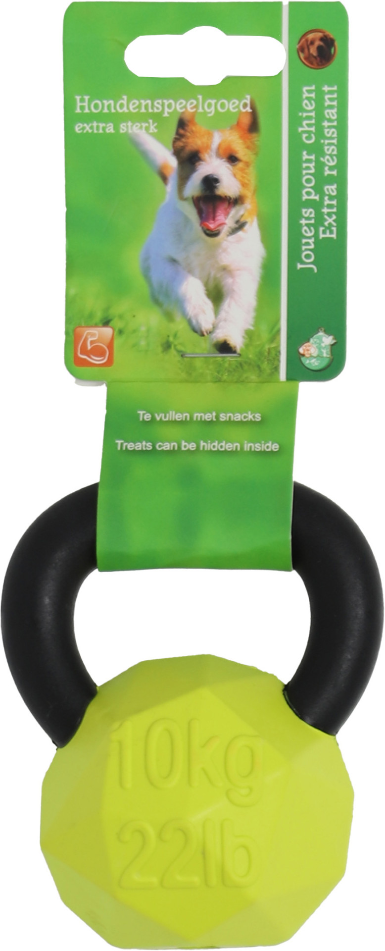 De kettlebell snacktoy, hét ultieme hondenspeeltje voor urenlang speelplezier! Gemaakt van sterk en duurzaam rubber met een stevig nylon handvat, is dit innovatieve hondenspeelgoed ontworpen om zelfs de meest energieke speelsessies te doorstaan. Geïnspireerd op de klassieke vorm van een kettlebell, is dit speeltjel perfect voor interactief spel en biedt het eindeloos vermaak voor uw viervoeter. Maar dat is nog niet alles, het is niet alleen een speeltje, het is ook een traktatie dispenser! Verborgen in zijn stevige rubberen vorm kunt u de favoriete snacks van uw hond verstoppen, waardoor speeltijd verandert in een smakelijke speurtocht. Of het nu gaat om apporteren, trekspelletjes of solo spel, de kettlebell stimuleert actieve betrokkenheid, mentale stimulatie en voldoet aan de natuurlijke instincten van uw hond om te zoeken en te kauwen.