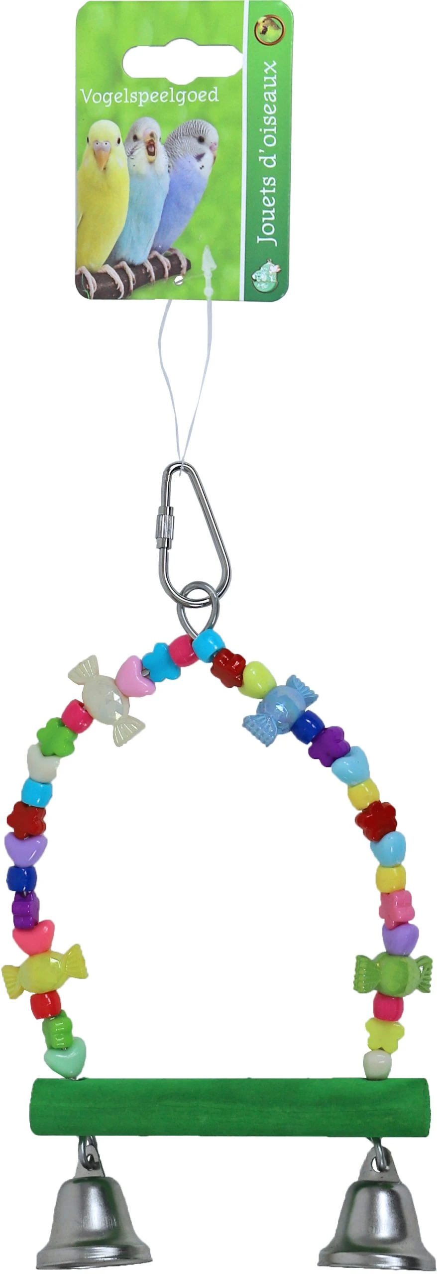 Vogelspeelgoed in de vorm van een schommel. Hang deze schommel in het midden van de kooi en je vogels kunnen plaatsnemen of genieten van een bewegend element, net zoals ze gewend zijn in de natuur, waar takjes van bomen ook bewegen. De twee bellen voegen vrolijke tonen toe. Alles wordt bij elkaar gehouden door een stevige metalen ring, compleet met een metalen ophanghaak en sluiting voor veilige bevestiging.