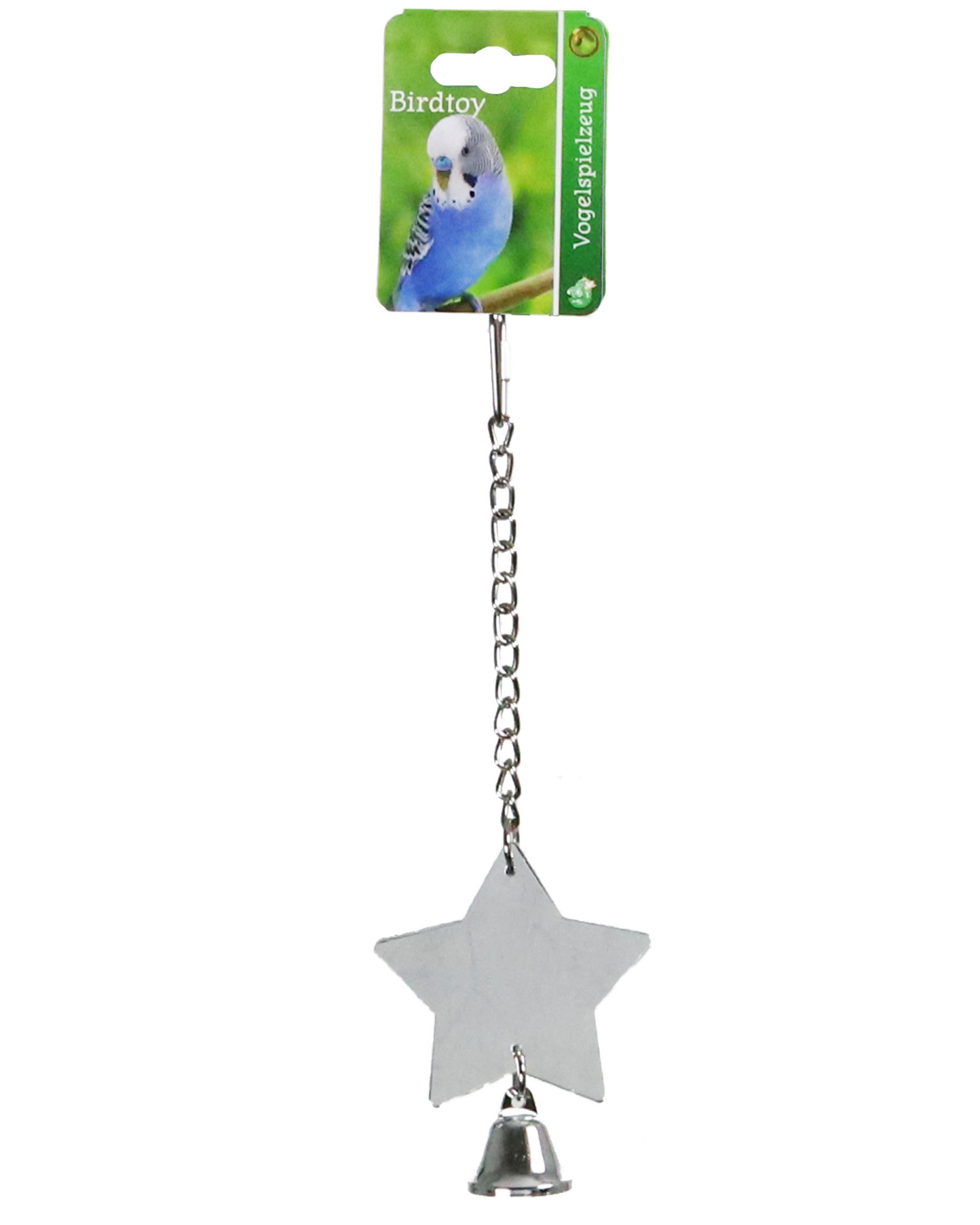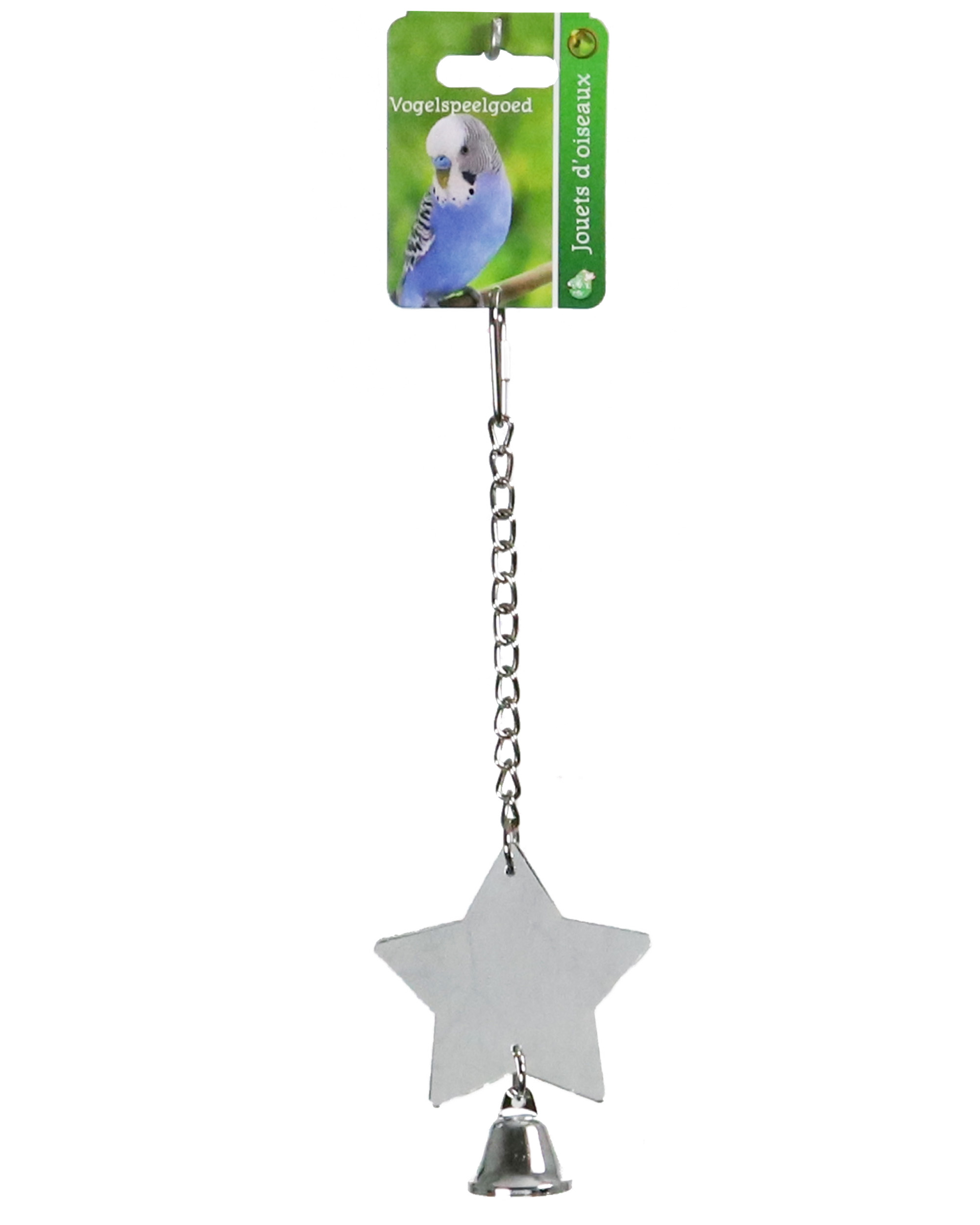 Deze 2-zijdige spiegel in de vorm van een ster, zodat uw vogel aan beide kanten zichzelf uitgebreid kan bekijken. De metalen bel zorgt voor extra attractiviteit. Diameter spiegel: 6cm