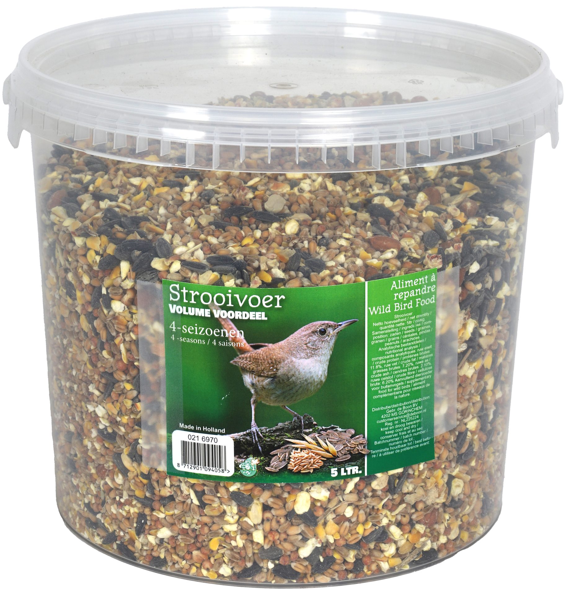Hersluitbare emmer met 5 liter strooivoer van hoge kwaliteit voor buitenvogels.