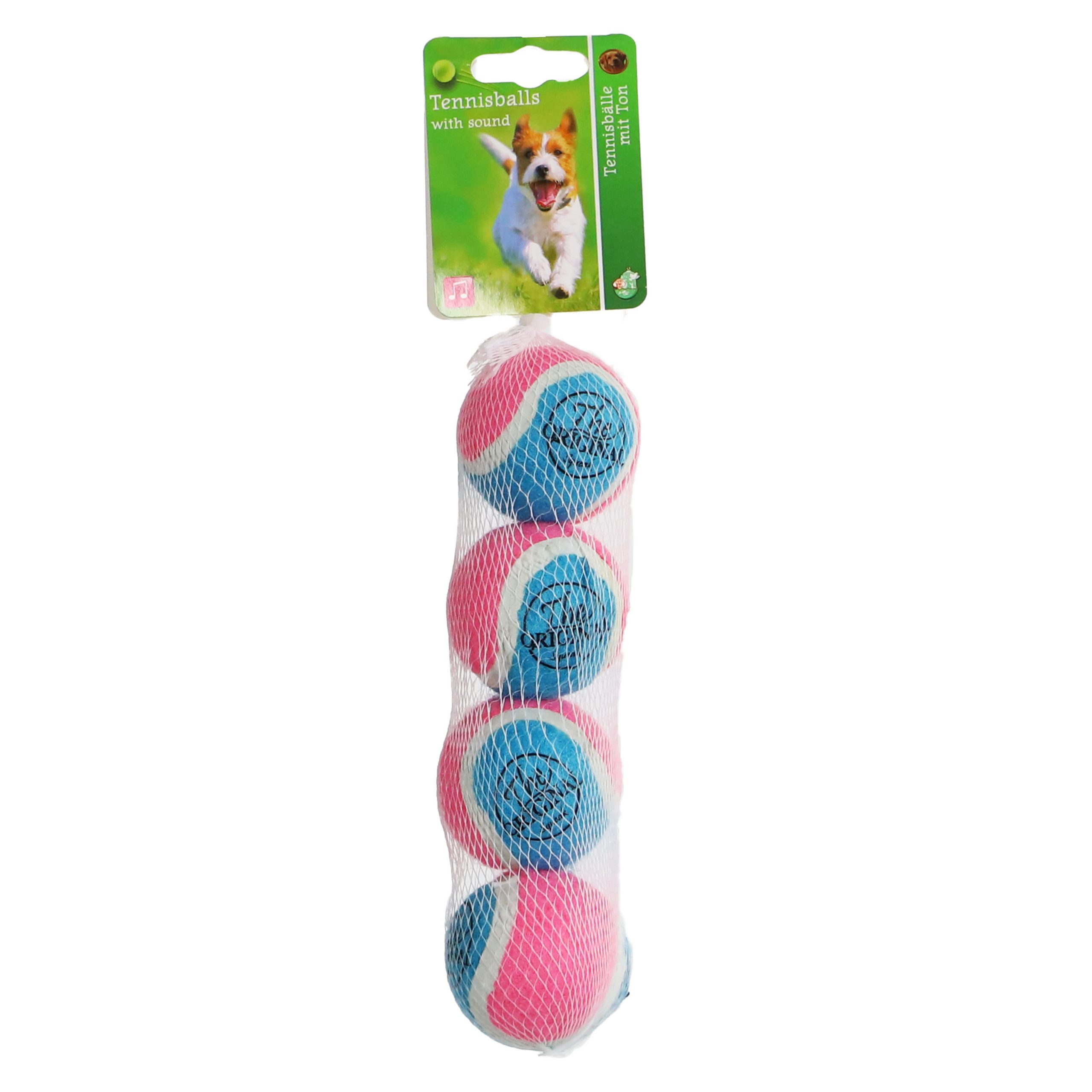 Net a 4 tennisballen “the original squeak” met een diameter van 5cm geschikt voor kleine honden.
