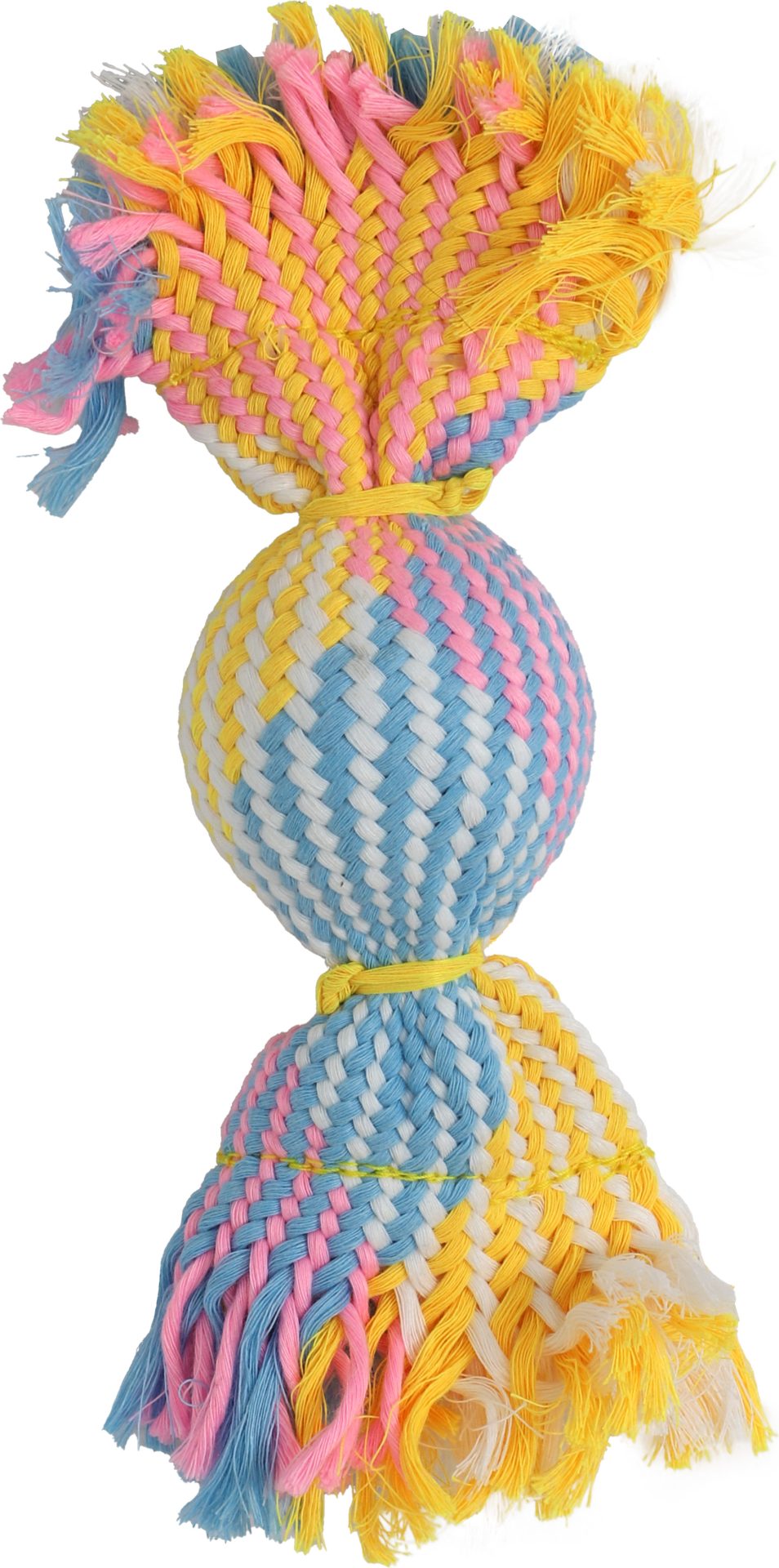 Maak elke speelsessie van uw hond onvergetelijk met onze kleurrijke toffee bal met piep! Deze vrolijke bal omweven met polyester garen in de vorm van een toffee is niet alleen een feest voor het oog met zijn vrolijke multicolor design, maar ook voor de oren van uw hond dankzij het ingebouwde piepje. Perfect om te apporteren, kauwen of gewoon lekker mee te spelen. Dit speeltje draagt bij aan een gezonde mondhygiëne vanwege de flossende werking tijdens het spelen. Of u nu binnen of buiten bent, dit speeltje houdt uw hond actief, blij en gezond, vanwege de extra lichaamsbeweging die uw hond zal ervaren tijdens het spelen met dit vrolijke speeltje. Een echte traktatie voor elke speelse viervoeter.