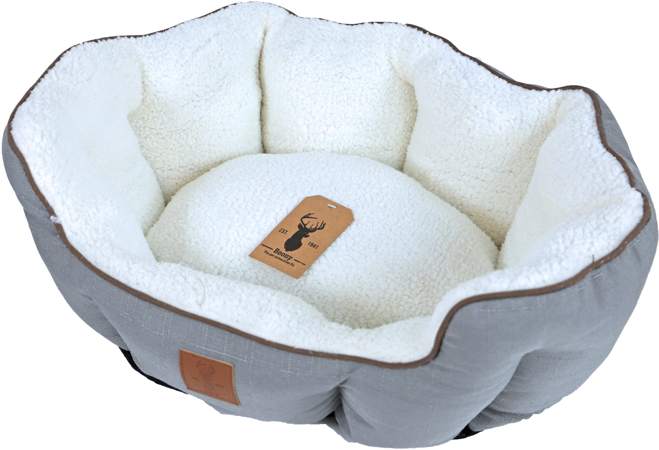 Deze stevige mand van Boony ‘Est 1941’ biedt je huisdier een comfortabele en veilige rustplek. De zachte binnenzijde, gemaakt van stof met een schapenwolstructuur, zorgt voor een luxe slaapervaring. De mand heeft een diameter van 60 cm, waardoor het perfect is voor katten en honden.