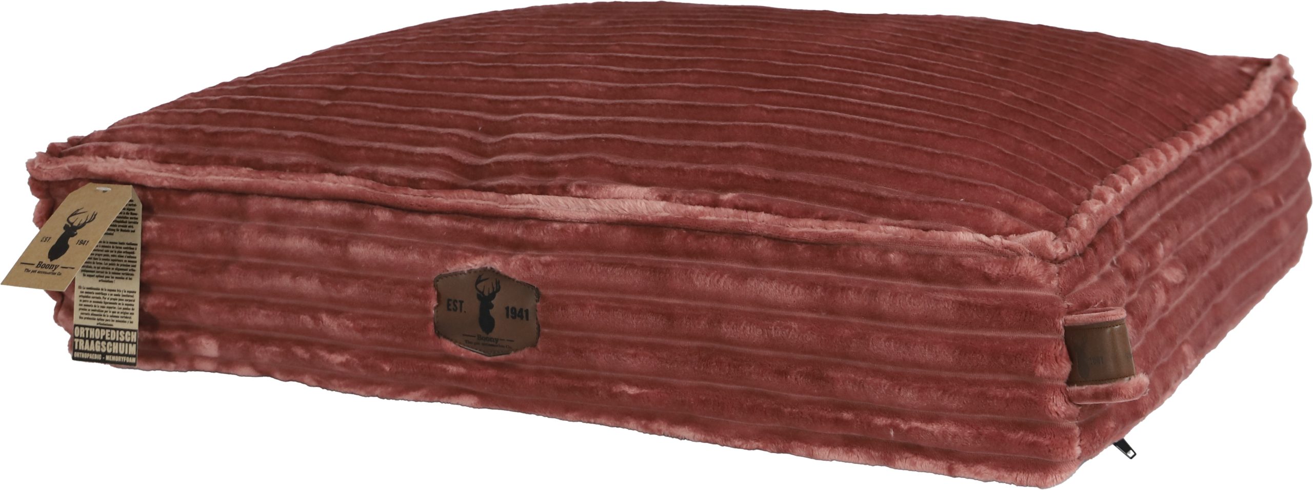 Dit Boony EST 1941 orthopedisch traagschuim kussen uit de premium range behoort tot de beste kussens welke u voor uw hond kunt aanschaffen. Het kussen biedt optimale ondersteuning aan de spieren en gewrichten van uw hond. De stevige vulling van traagschuim draagt bij aan een orthopedisch verantwoorde (nacht)rust. Door zijn eigen lichaamsgewicht zakt uw hond licht weg in het traagschuim. Drukpunten worden geneutraliseerd waardoor een orthopedisch correcte uitlijning van de wervelkolom ontstaat. De extreem zachte velvet stof van dit kussen biedt uw hond extra comfort en zorgt ervoor dat het ligcomfort tot een maximum wordt gebracht. Het grove corduroy ziet er erg stijlvol en modern uit, waardoor het kussen perfect in te passen is in verschillende interieurs.
