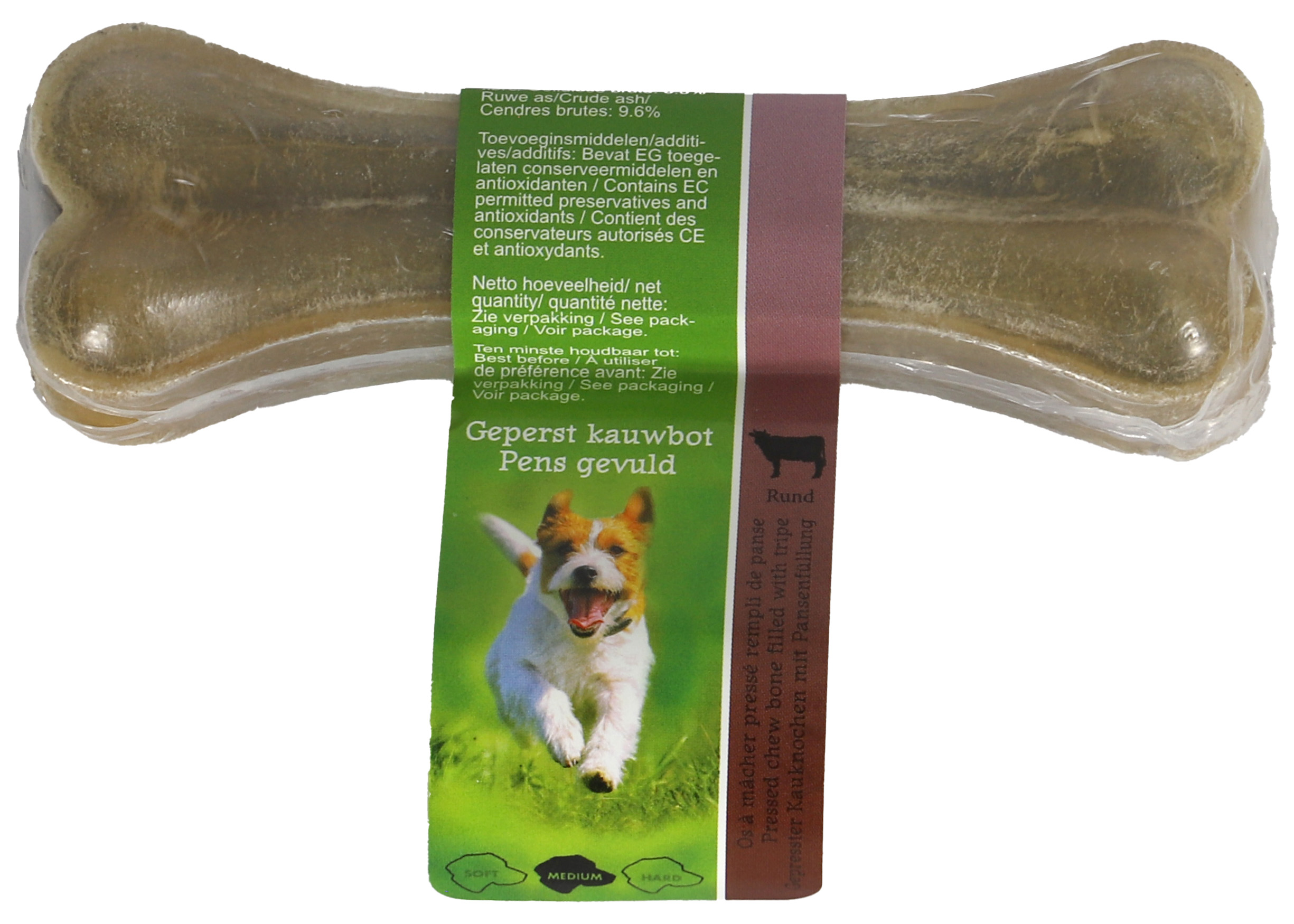Geperst bot van buffelhuid gevuld met pens. De pensvulling maakt dit bot onweerstaanbaar lekker en de buffelhuid buitenkant zorgt voor extra lang kauwplezier. Thailand A kwaliteit. 100% natuurlijk.