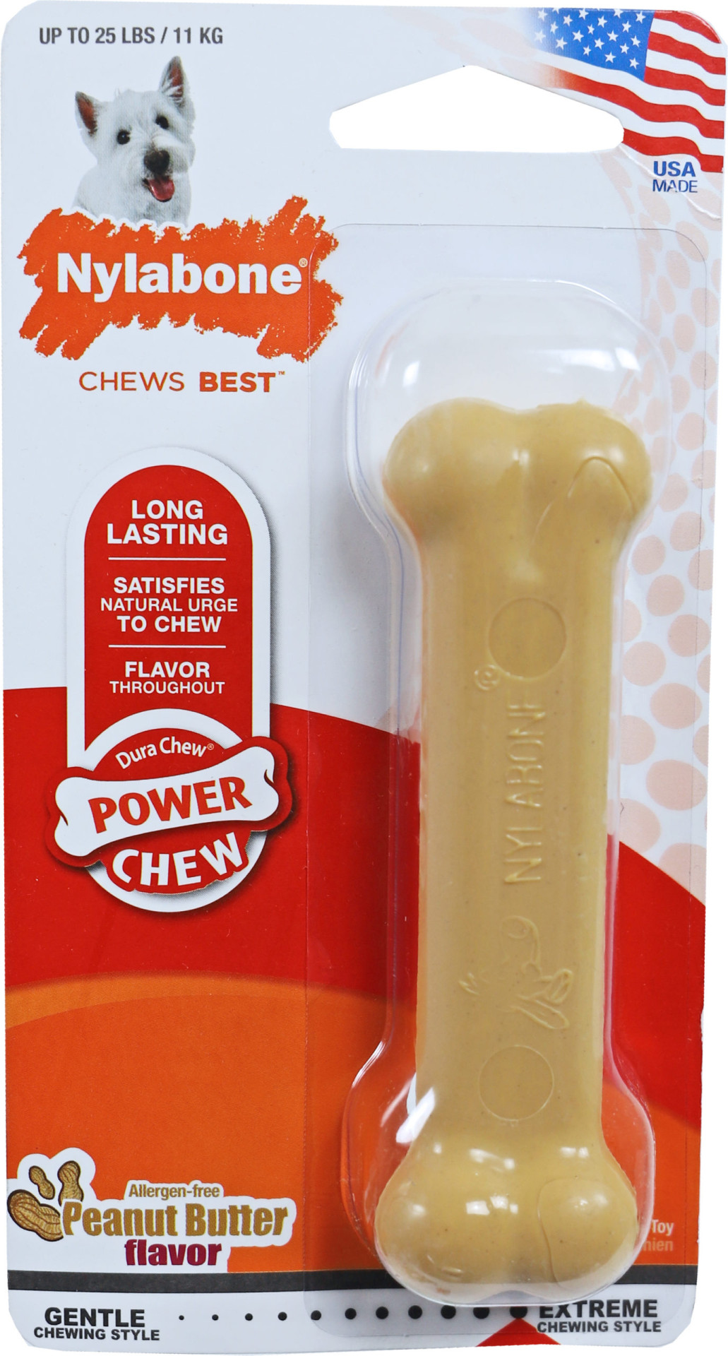 Nylabone Dura Chew bot peanutbutter, 100% hypo allergene kluif, geschikt voor volwassen honden met een flinke kauwbehoefte. Deze kluif is bijna onverwoestbaar en zal bij intensief kauwen langzaam slijten. De borsteltjes die erop ontstaan zorgen voor een tandenpoetsend effect. De schraapsels die ervan komen (niet groter dan een rijstkorrel) kunnen geen kwaad, want dit wordt niet door het lichaam opgenomen en verdwijnt via de natuurlijke weg uit het lichaam.