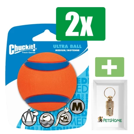 Chuckit Ultra Bal – MEDIUM 6X6X6 CM – Hondenspeelgoed – 2 stuks – Inclusief Goudkleurige PetsHome Adreskoker