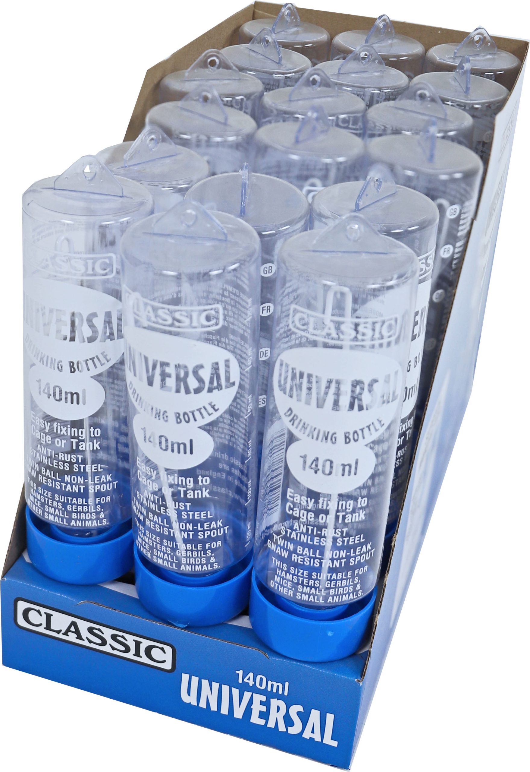 Een drinkfles Classic 140 ml. Gemaakt van recyclebaar materiaal. Transparant, zodat u kunt zien of er nog voldoende water in zit. Met een RVS tuitje, voorzien van dubbelkogeltechniek, zodat de fles niet gaat lekken. Makkelijk op te hangen door ophangoog bijgeleverde buigbare ijzerdraad.