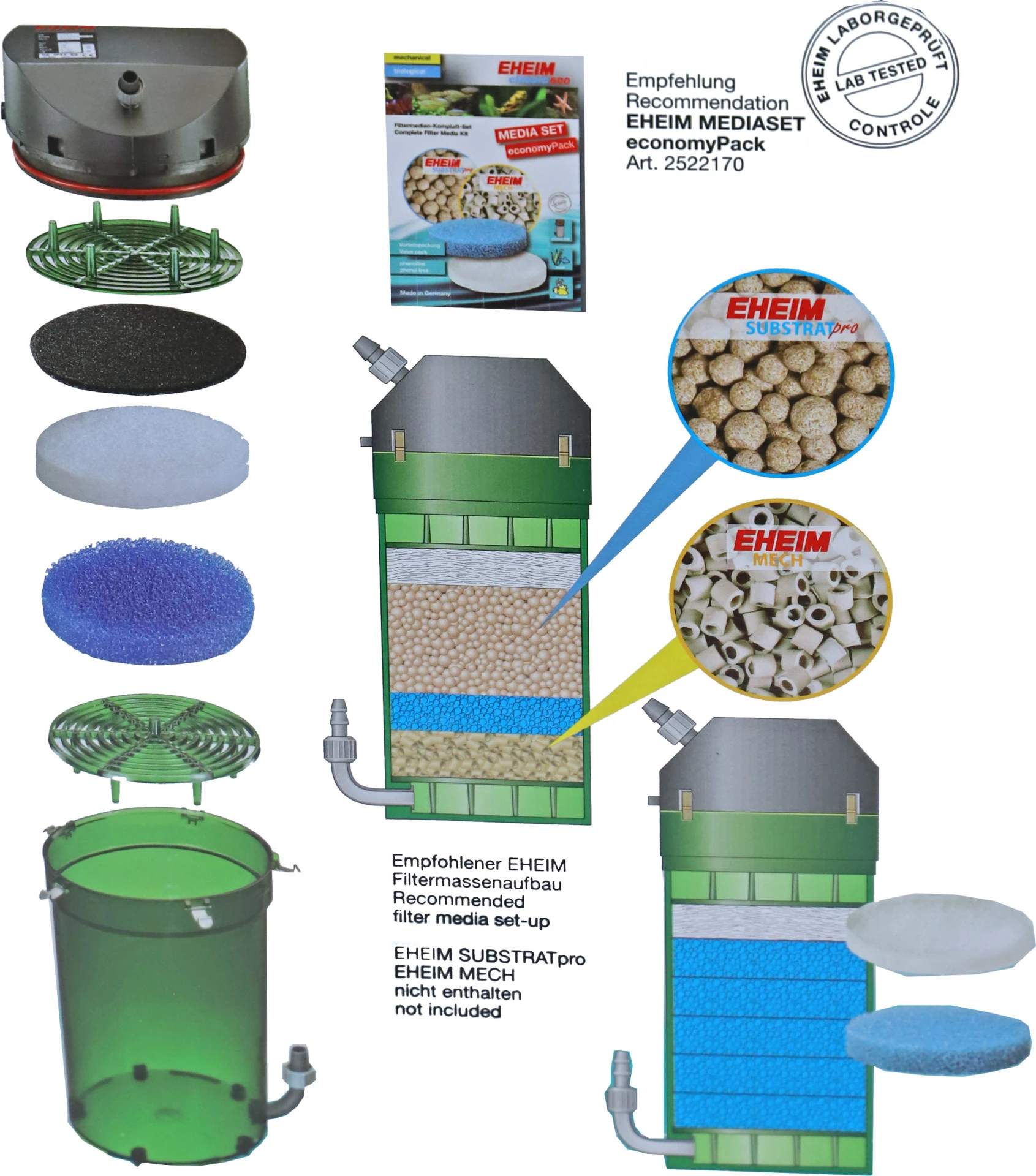 Het filter kan worden gebruikt met grove en fijne filterpads. We raden echter aan om een filtermedia-laagopstelling te gebruiken met EHEIM filtermedia. Hiervoor zijn filtermediareeksen beschikbaar voor elk model (behalve Classic 150).