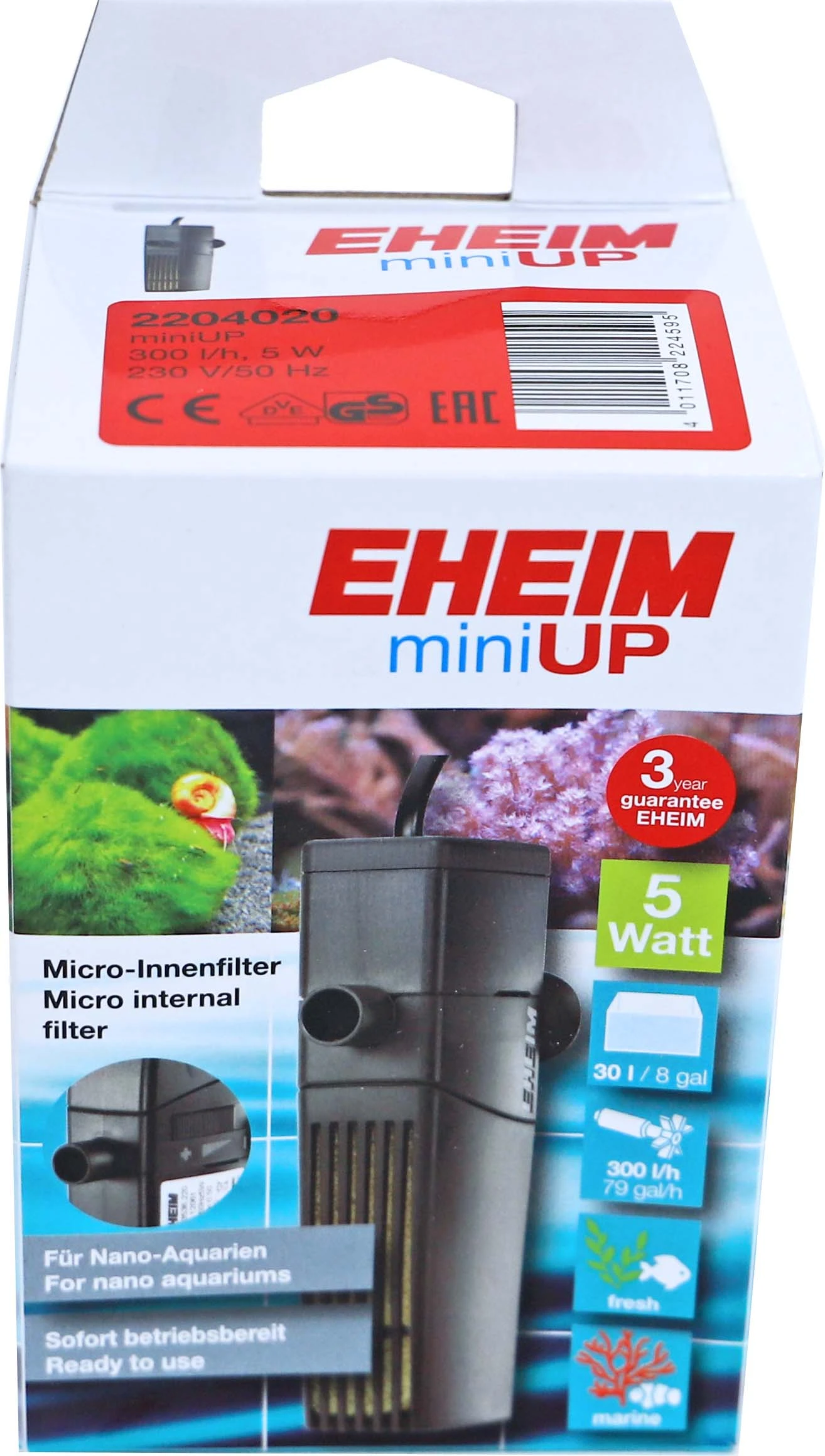 Met de EHEIM miniUP micro-interne filter krijgt jouw nano-aquarium aantrekkelijke en praktische toevoegingen.Het is klein, aantrekkelijk, levert uitstekende prestaties en is eenvoudig aan de tank te bevestigen met zuignappen. De filter zuigt het water van onderaf door spleten aan, pompt het door het filterspons en leidt het gefilterd terug het aquarium in. Je kunt ook een uitstroomslang bevestigen en dan ben je in staat om de uitstroomrichting aan te passen. Het is gewoonweg een aantrekkelijke en praktische filter in een compact formaat.Voordelen van de EHEIM miniUP:Micro-interne filter voor aquariums (nanotanks) van 25 tot 30 literAantrekkelijk, slank ontwerpWaterinlaat van onderafConnector voor uitstroomslangWordt volledig uitgerust met filterspons geleverd, direct klaar voor gebruikSlechts 5 W energieverbruik