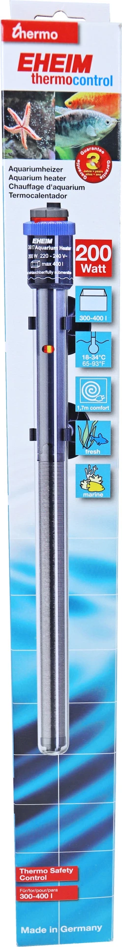 Eheim regelbare aquarium verwarmers voor aquaria, van 20 tot 1000 liter inhoud. Met droogloopbeveiliging (Thermo Safety Control). Gemaakt van stabiel speciaalglas, nauwkeurige temperatuurregeling (18-34 graden Celsius) en geheel onder te dompelen (waterdicht). Controlelampje geeft verwarmfunctie aan. Extra lang snoer ± 170 cm. Inclusief 2 zuignappen. Geschikt voor zoet- en zeewater.