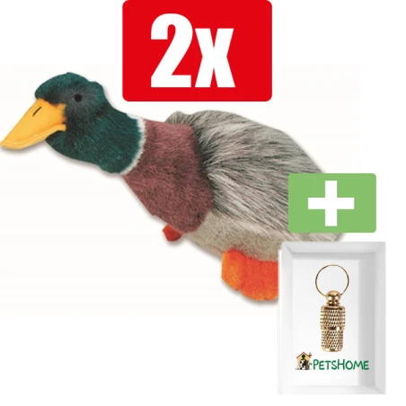 Happy Pet Migrator Pluche Wilde Eend – Hondenspeelgoed – Large 38 cm – 2 Stuks – Inclusief PetsHome Goudkleurige Adreskoker
