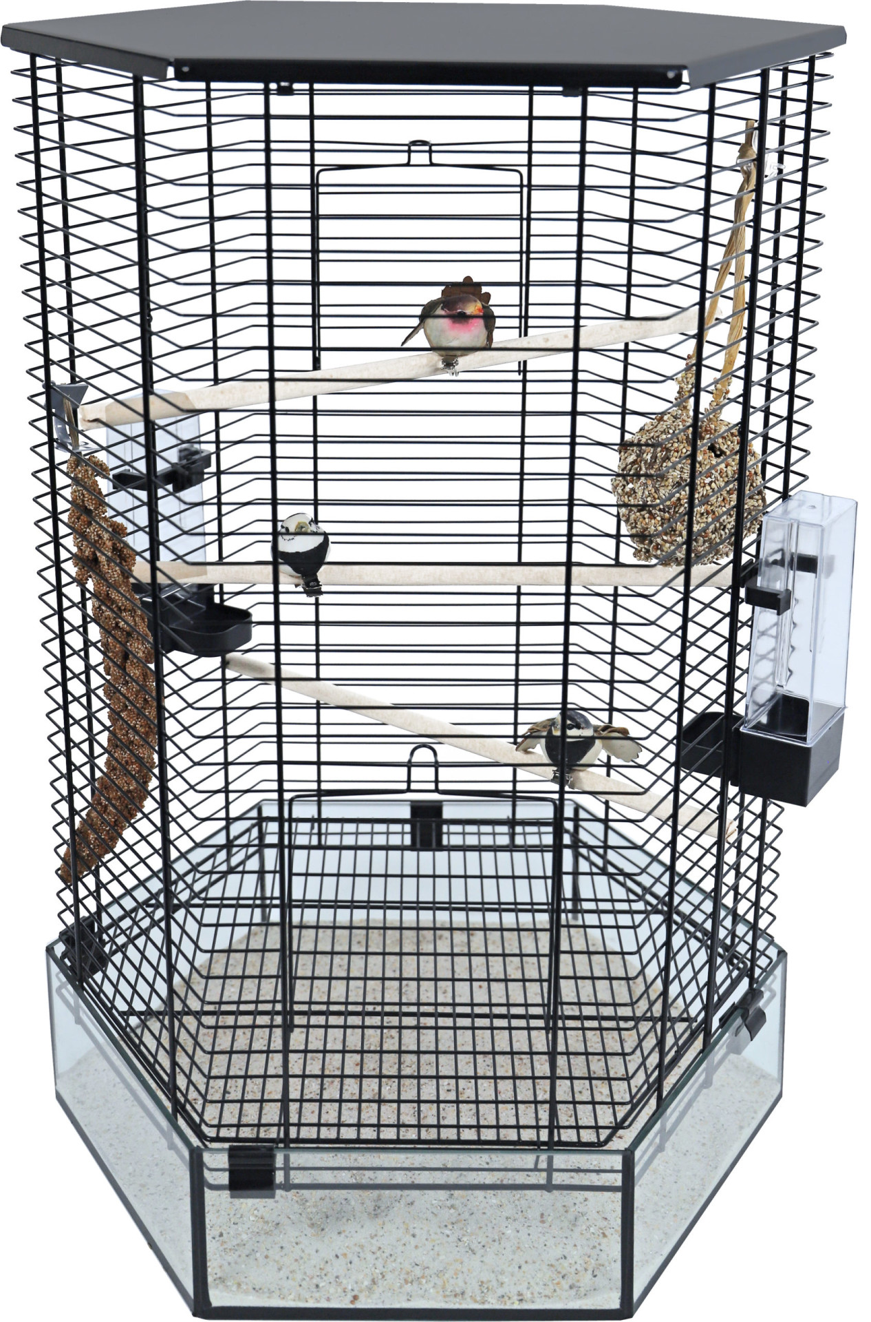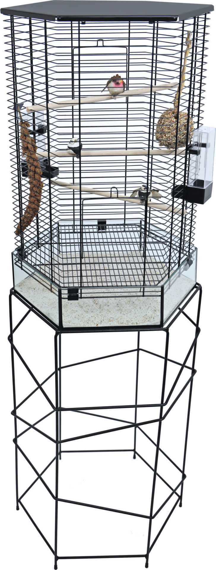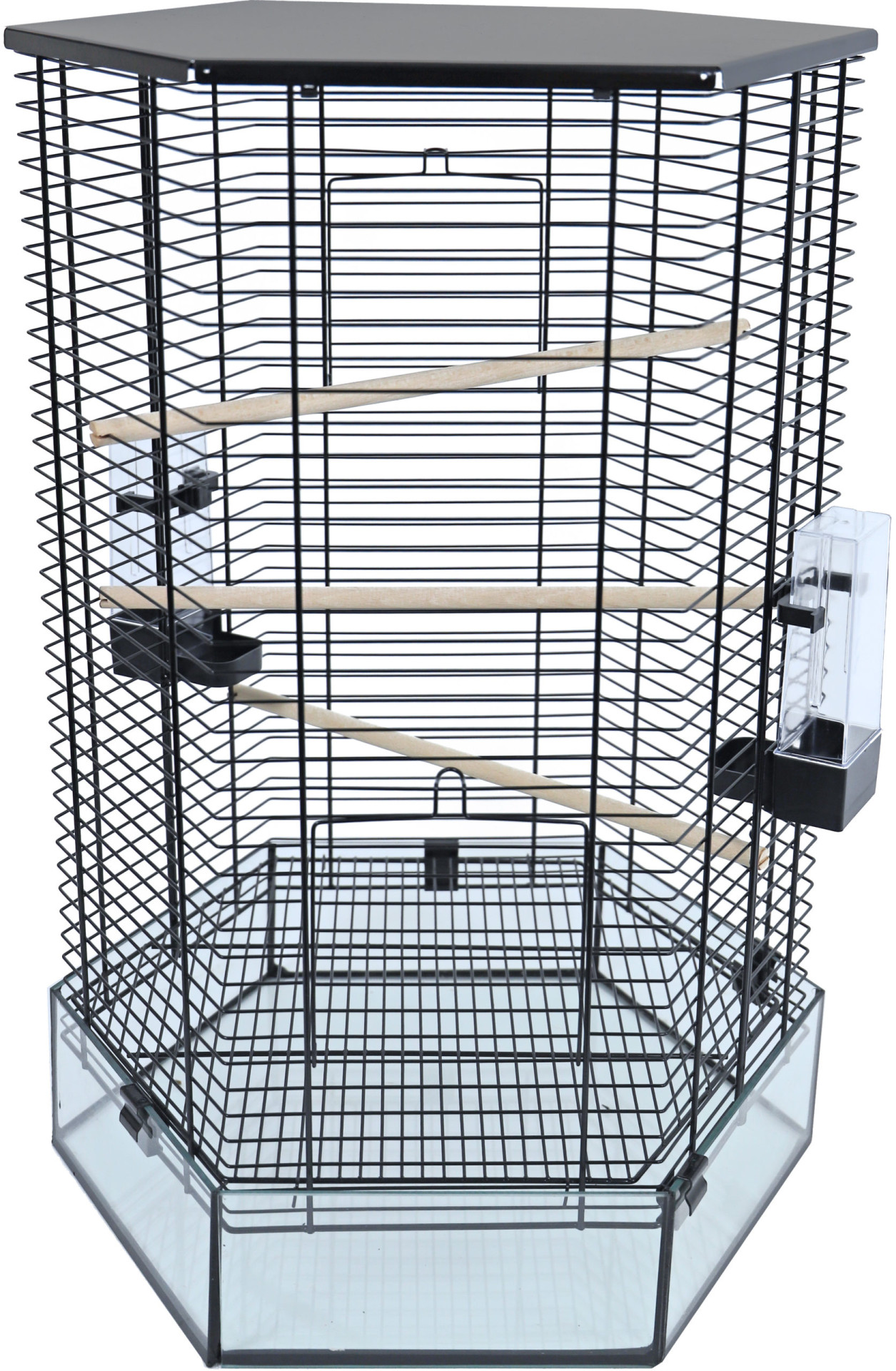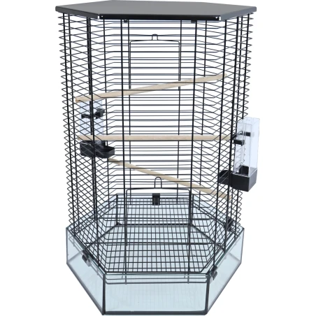 Interzooi vogelkooi Vision hexo zwart is een unieke vogelkooi door de achtkantige vorm, maar vooral door de glazen achtkantige onderbak. Voor deze kooi is een draadstandaard te verkrijgen.