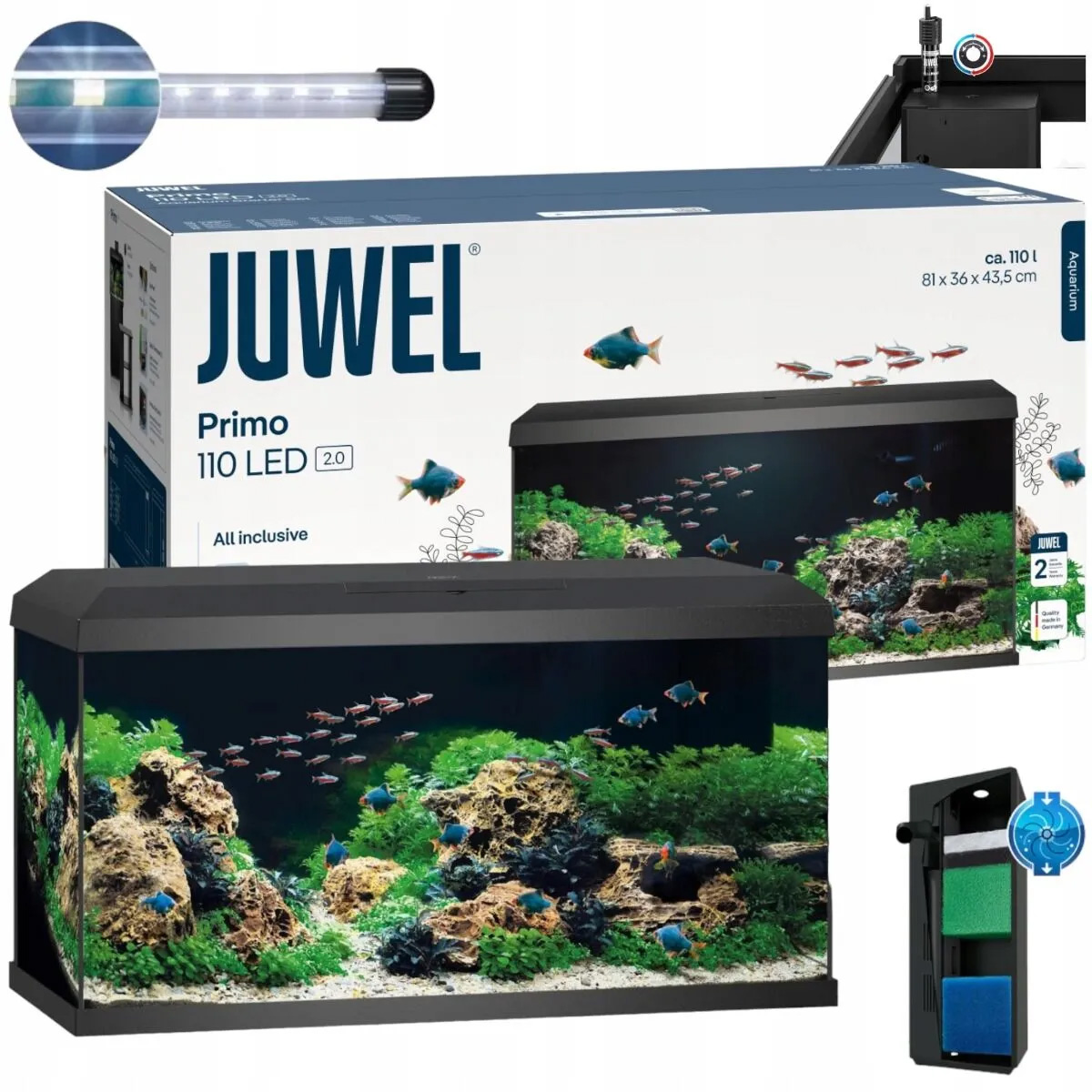De JUWEL AquaHeat 100 Watt instelbare verwarming zorgt voor de juiste temperatuur in de Primo 110 LED. De verwarming blijft onzichtbaar in het aquarium, omdat deze is geïntegreerd in de filterbehuizing. De instelbare verwarming is ook TÜV/GS gecertificeerd.