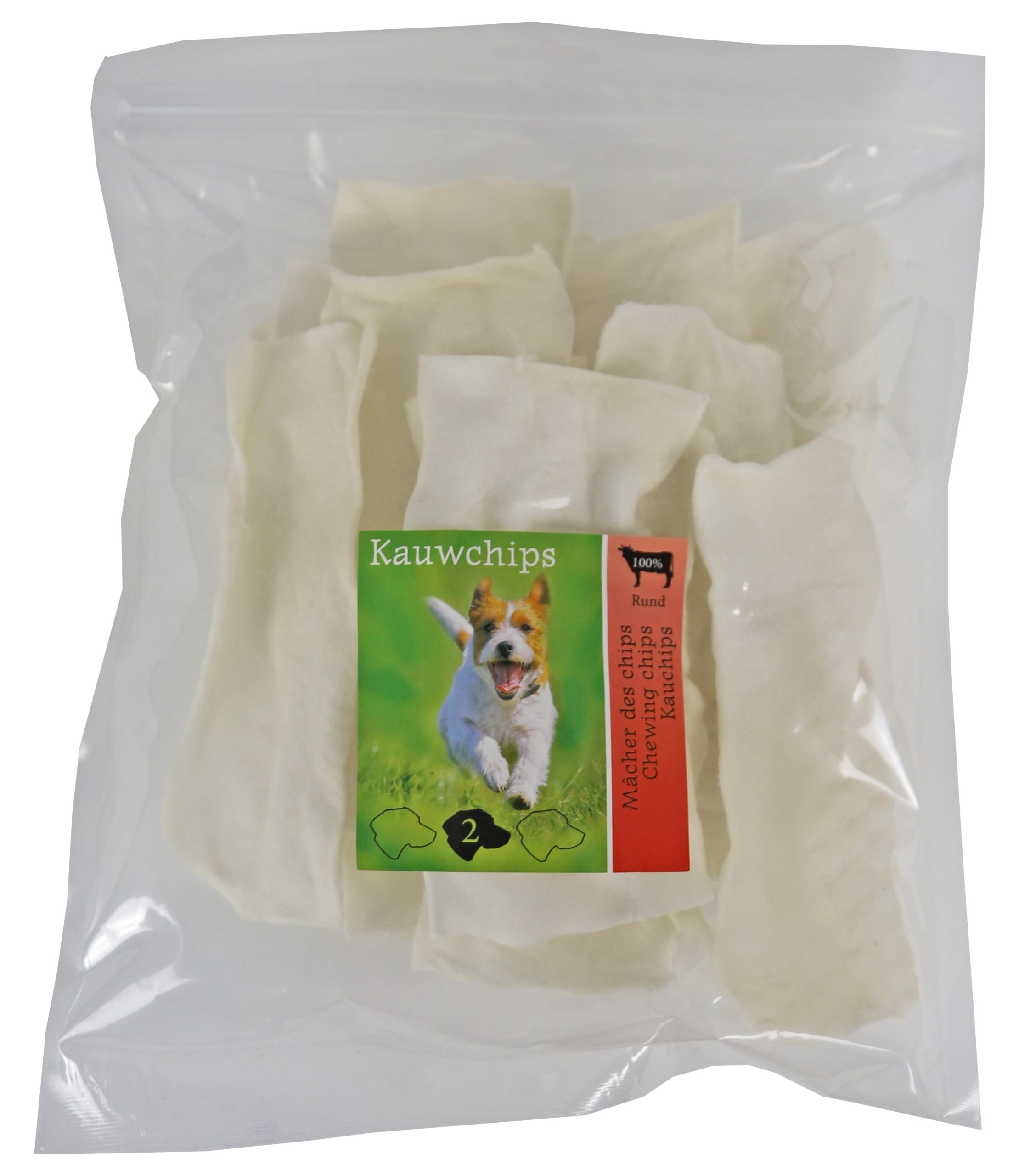 Runderkauwchips naturel. Een heerlijke traktatie die voor veel kauwplezier zorgt. De chips is ook uitermate geschikt voor honden die hun tanden nog aan het wisselen zijn, door de platte vorm is het ook goed kauwbaar achter in het gebit. 200 gram per verpakking.