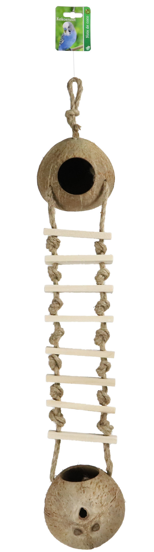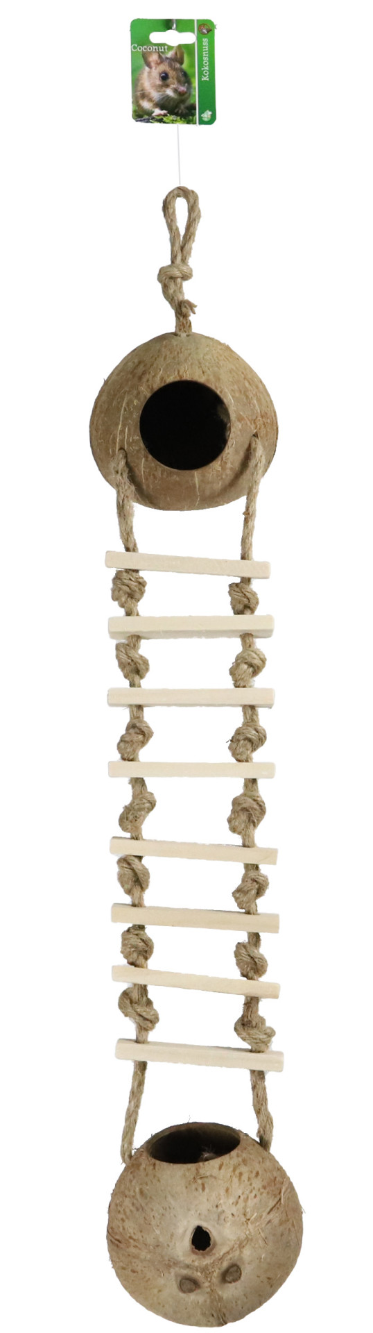 De touwladder tussen de kokosnoten zorgt ervoor dat uw huisdier gemakkelijk van de ene naar de andere schuilplaats kan klimmen. Vanwege de bevestigingspunten aan de uiteinden van de kokosnoten, kan dit product makkelijk in ieder verblijf worden geplaatst.