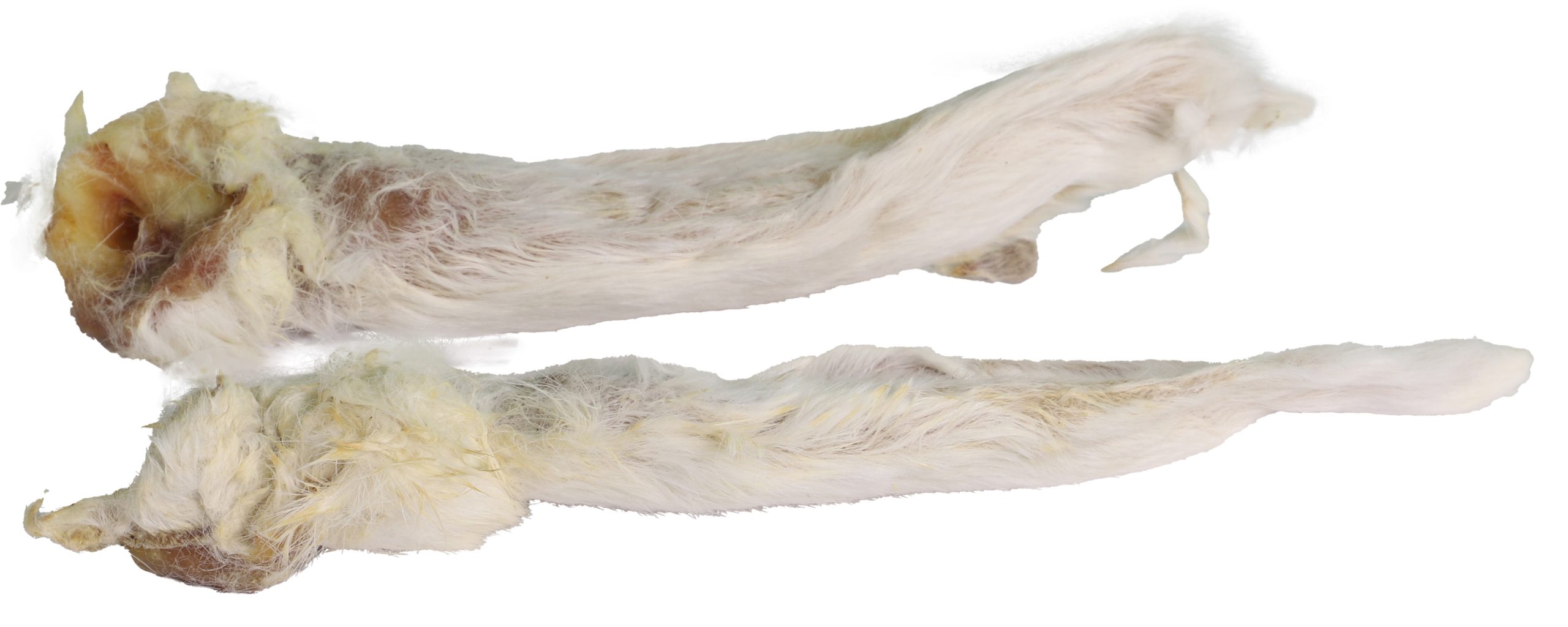 Konijnenoren met vacht. Het haar van de vacht heeft een functionele werking tijdens het snacken. Het borstelt de maag en darmen daarnaast draagt het bij aan een goede darmflora. Zonder toevoegingen en vetarm.