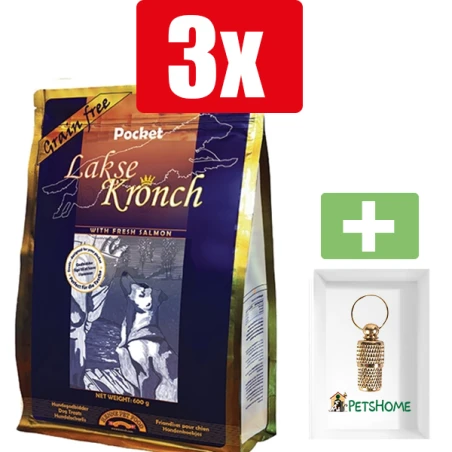 Kronch 76% Zalmsnacks Pockets – Hondensnacks – 600 GR – 3 Stuks – Inclusief PetsHome Goudkleurige Adreskoker