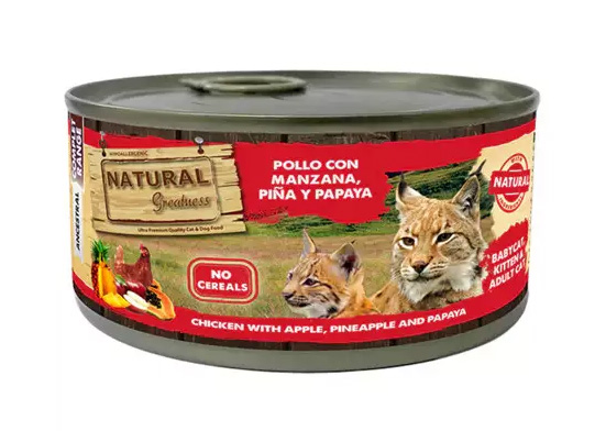 natvoer voor kittens en volwassen katten met kip, appel, ananas en papaya.