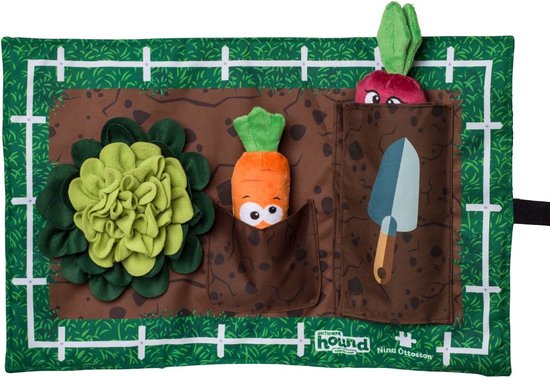 Nina Ottosson Activity Matz garden game laat uw hond verstoppertje spelen met lekkernijen, eten, speelgoed of botten. Houdt uw hond bezig met 3 fysieke en mentale uitdagingen. Verhoog de uitdaging door meer verborgen traktatiezakjes en sluitingen op te nemen.
