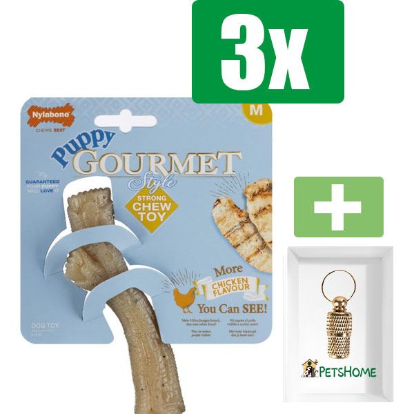 Nylabone Puppy Gourmet Stick Kip – Medium – Kauwbot – Hondenspeelgoed – Kauwspeelgoed – 3 stuks – Inclusief Goudkleurige PetsHome Adreskoker