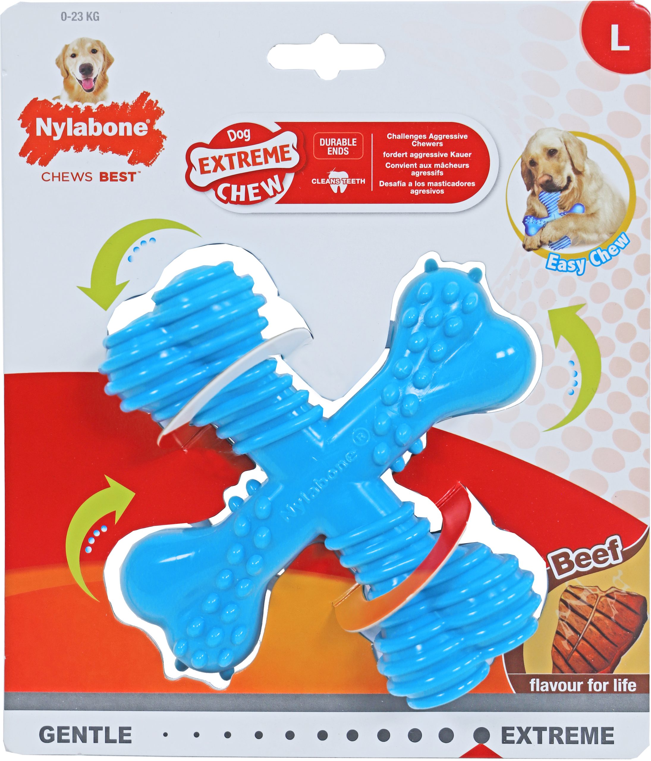 Nylabone producten zijn zeer duurzaam. Ze slijten langzaam en dragen bij aan het tegengaan van tandplak en tandsteen door het ruwe oppervlak dat ontstaat tijdens het kauwen. Hierbij kunnen kleine stukjes afgeschraapt worden die je hond doorslikt. Dit is onschadelijk, deze stukjes worden niet opgenomen door het lichaam en verlaten via de ontlasting het lichaam, geheel op natuurlijke wijze. Nylabone is schoon, sterk, smaakvol en goed voor het gebit. Deze Nylabone Power Chew X Bone heeft een rundsmaak tot aan de kern van het product zodat je hond optimaal blijft genieten. Alle speeltjes zijn gemaakt van hoogwaardig nylon en worden geproduceerd in Amerika. De Nylabone X Bone large is geschikt voor volwassen honden tot ongeveer 23 kg. Het is de ideale combinatie tussen een speeltje en een kauwbot.