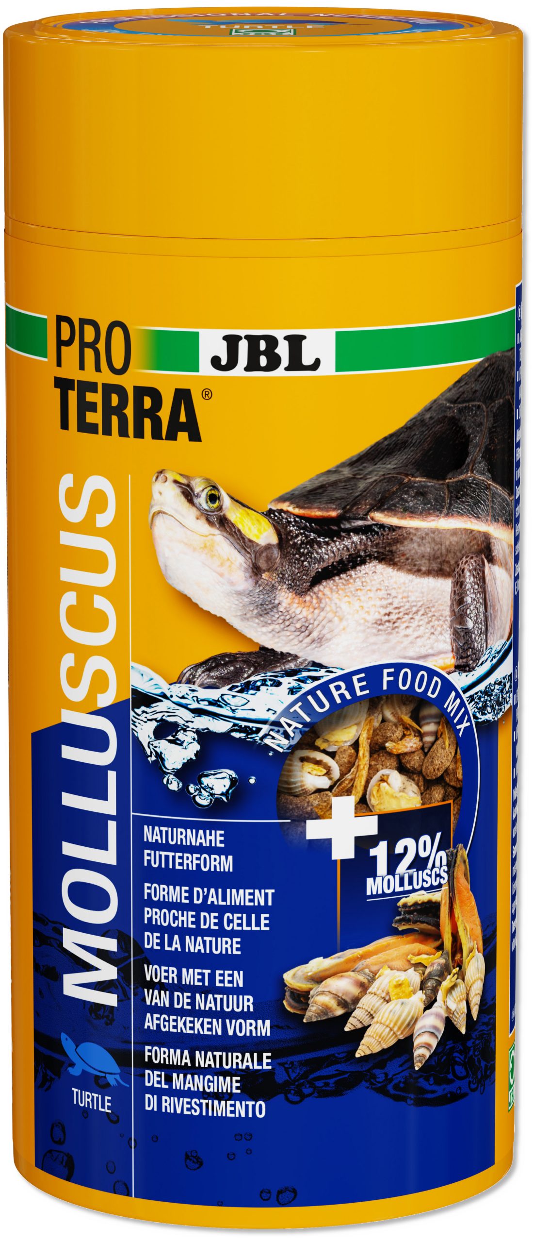 De Proterra Molluscus bevat hele slakken, gammarus en vissticks voor een afwisselende verzorging van alle water- en moerasschildpadden. De hele slakken, met al hun waardevolle stoffen, worden zacht gedroogd en vormen zo een belangrijke, vitaminerijke aanvulling op het primaire schildpaddenvoer JBL PROTERRA CRUSTARUS. Tijdens JBL expedities werd geconstateerd dat alle soorten waterschildpadden vaak en graag slakkenhuisjes aten. Zonder toevoeging van kunstmatige kleurstoffen en conserveringsmiddelen. Potje, deksel, folie en etiket 100% recyclebaar. Deze verpakking bevat 1000ml.