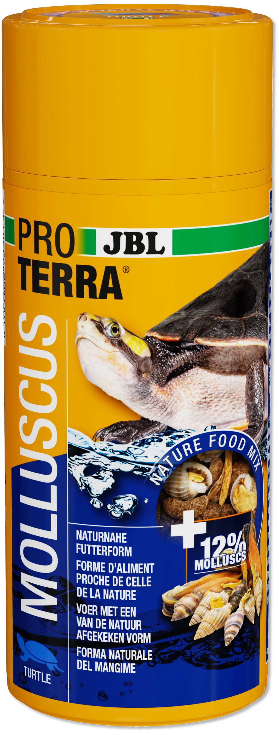 De Proterra Molluscus bevat hele slakken, gammarus en vissticks voor een afwisselende verzorging van alle water- en moerasschildpadden. De hele slakken, met al hun waardevolle stoffen, worden zacht gedroogd en vormen zo een belangrijke, vitaminerijke aanvulling op het primaire schildpaddenvoer JBL PROTERRA CRUSTARUS. Tijdens JBL expedities werd geconstateerd dat alle soorten waterschildpadden vaak en graag slakkenhuisjes aten. Zonder toevoeging van kunstmatige kleurstoffen en conserveringsmiddelen. Potje, deksel, folie en etiket 100% recyclebaar. Deze verpakking bevat 250ml.