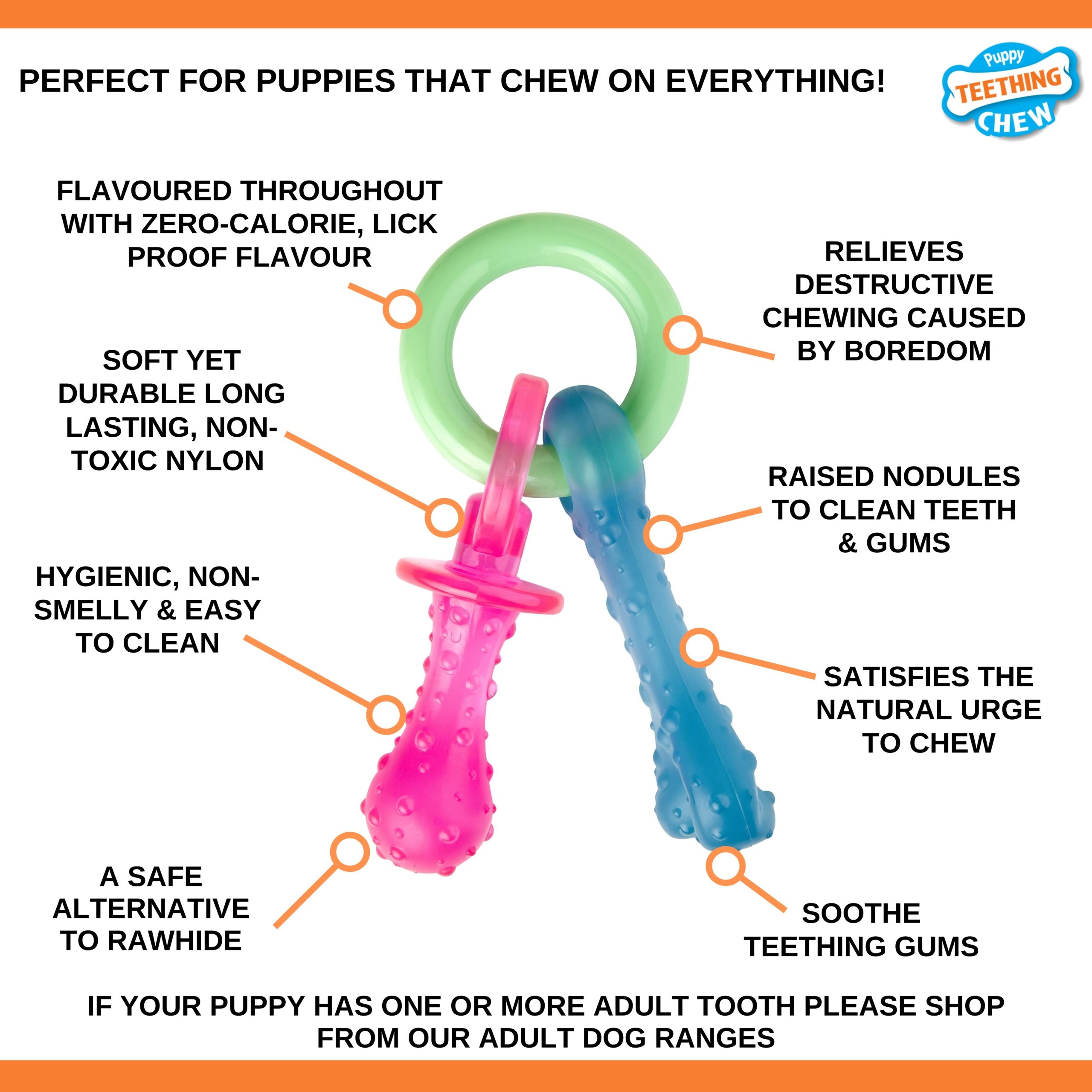 Nylabone puppy kluiven, onmisbaar voor de ontwikkeling van het gebit. Bevordert de kauwgewoonten en is kalmerend voor het tandvlees van de pup. Geschikt tot het tandwisselen.