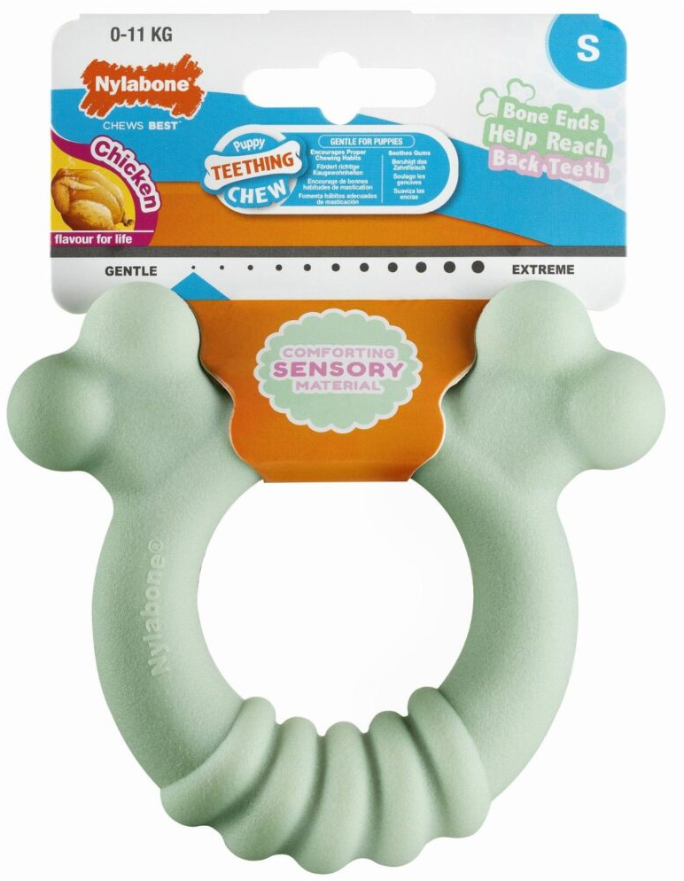 Geef uw pup de tandverzorging die hij of zij verdient met de Nylabone Tactile Ring. Gemaakt van zeer zacht, comfortabel aanvoelend materiaal, voor de ideale kauwervaring! Heeft uw pup last van zijn of haar tandjes, geef dan de Nylabone Tactile Ring voor een extra prettige tandverzorging. Door middel van de uitstekende botjes op de ring, worden ook de achterste tandjes gemakkelijk bereikt en dus ook gelijk verzorgd. Uitgevoerd met een heerlijke kipsmaak voor extra kauwplezier. Geschikt voor honden tot 11 kg.