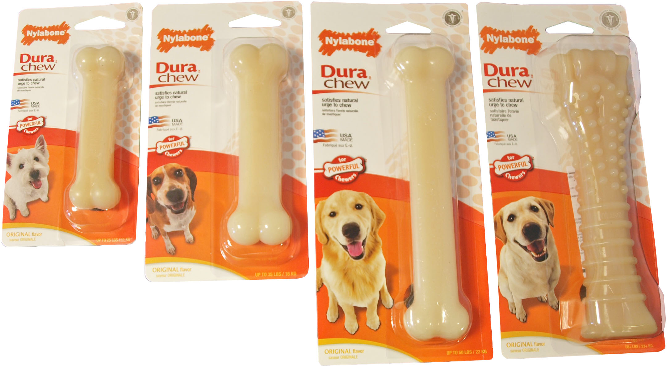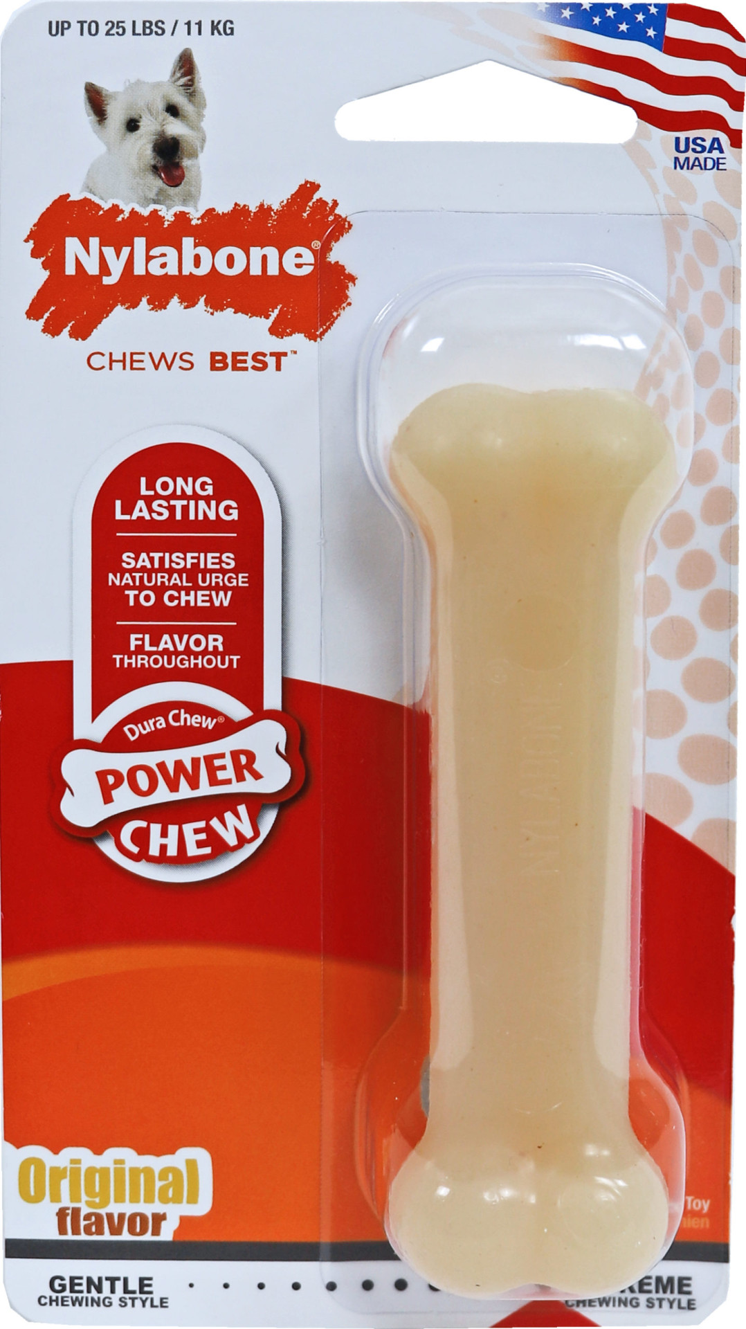 Nylabone Dura Chew bot original, geschikt voor volwassen honden met een flinke kauwbehoefte. Deze kluif is bijna onverwoestbaar en zal bij intensief kauwen langzaam slijten. De borsteltjes die erop ontstaan zorgen voor een tandenpoetsend effect. De schraapsels die ervan komen (niet groter dan een rijstkorrel) kunnen geen kwaad, want dit wordt niet door het lichaam opgenomen en verdwijnt via de natuurlijke weg uit het lichaam.