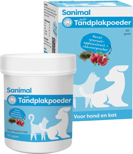 Sanimal anti-tandplakpoeder 60gr ondersteunt gebitsverzorging bij hond en/of kat en draagt bij aan dagelijkse verzorging.
