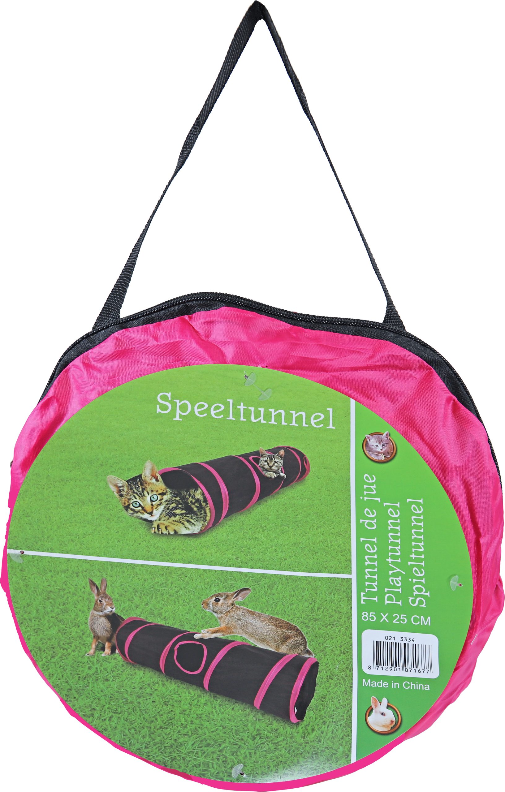 Nylon speeltunnel. Met zijn diameter van 25 cm geschikt voor katten, kleine puppy’s of konijnen. Voorzien van 2 speeltjes en gemakkelijk opvouwbaar. Wordt geleverd met handige opberghoes.