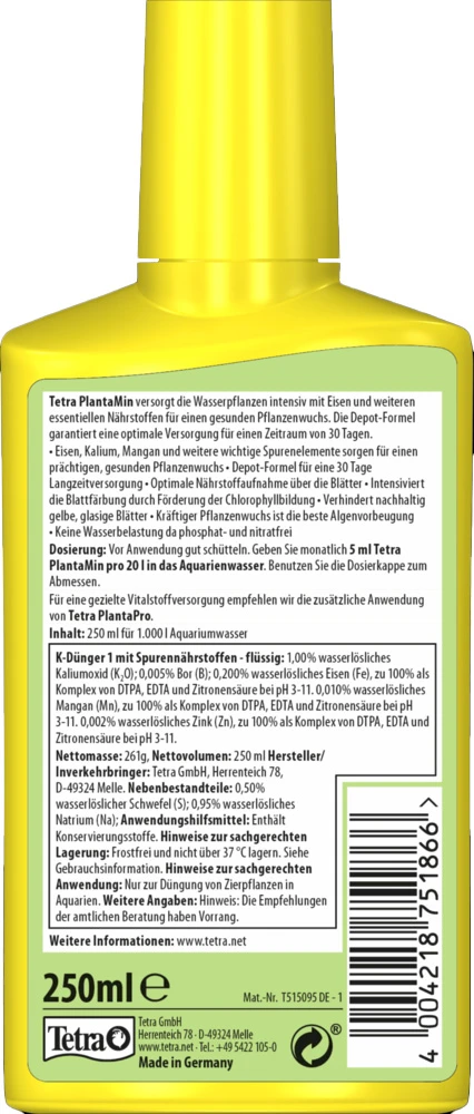 Goed schudden voor gebruik. Elke maand 5 ml Tetra PlantaMin per 20 liter
