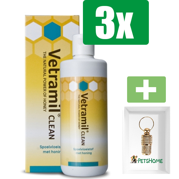 Vetramil Clean Spoelvloeistof 100 ml – 3 stuks – Inclusief PetsHome Goudkleurige Adreskoker