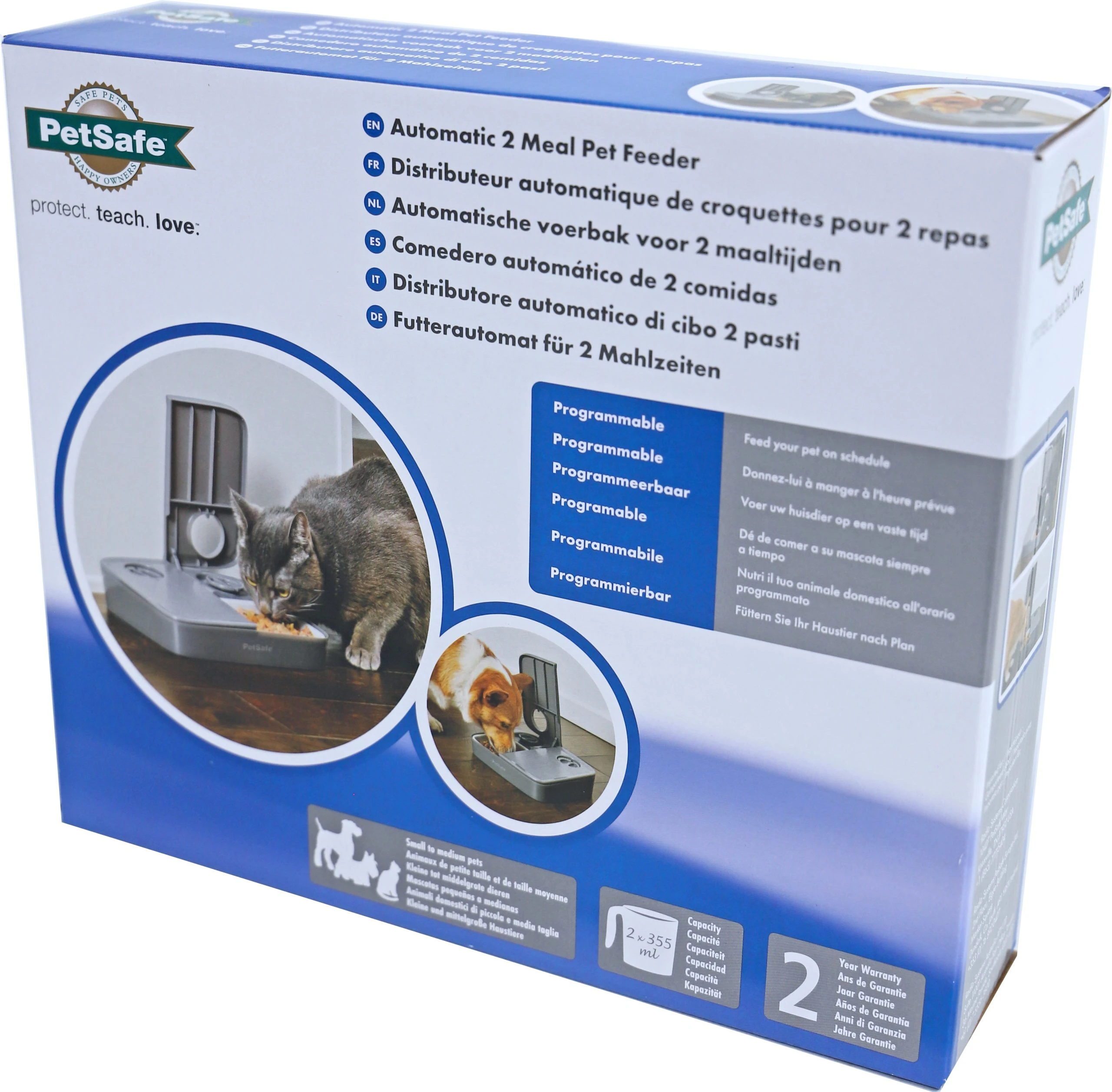 De PetSafe voederautomaat voor 2-maaltijden werkt op batterijen en geeft voer, snacks en medicijnen af op elk gewenst tijdstip – 24/7. Ideaal voor zowel uw hond als kat. Er zijn twee bakjes en een timer waarmee kan worden aangegeven wanneer welk bakje voer geeft. Het eenvoudig te lezen display en de vaatwasser bestendige bakjes zorgen voor een gebruiksvriendelijke voerbak. Batterij 1x AA.
