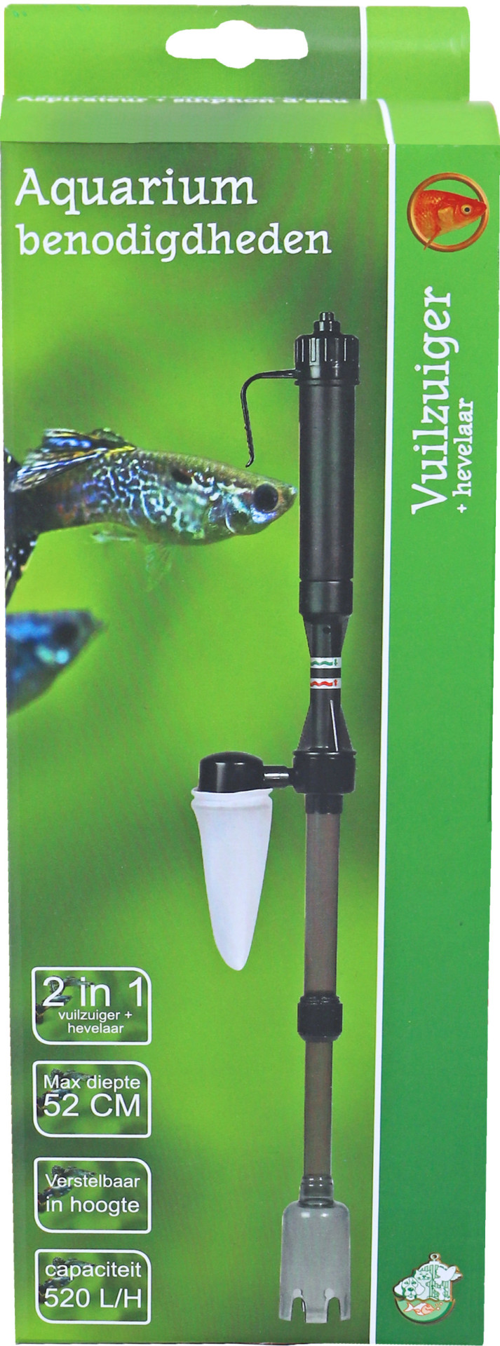 Vuilzuiger op batterijen. Voorzien van aan/uit schakelaar, ophanghaak, waterlevelmarkering en de mogelijkheid tot het aansluiten van een filterzak of hevelslang. Werkt op 2 stuks 1,5V – L – batterijen ( niet meegeleverd ) het apparaat is dankzij de telescopische steel te gebruiken voor aquaria met een waterdiepte van +/- 20 cm tot 60 cm.