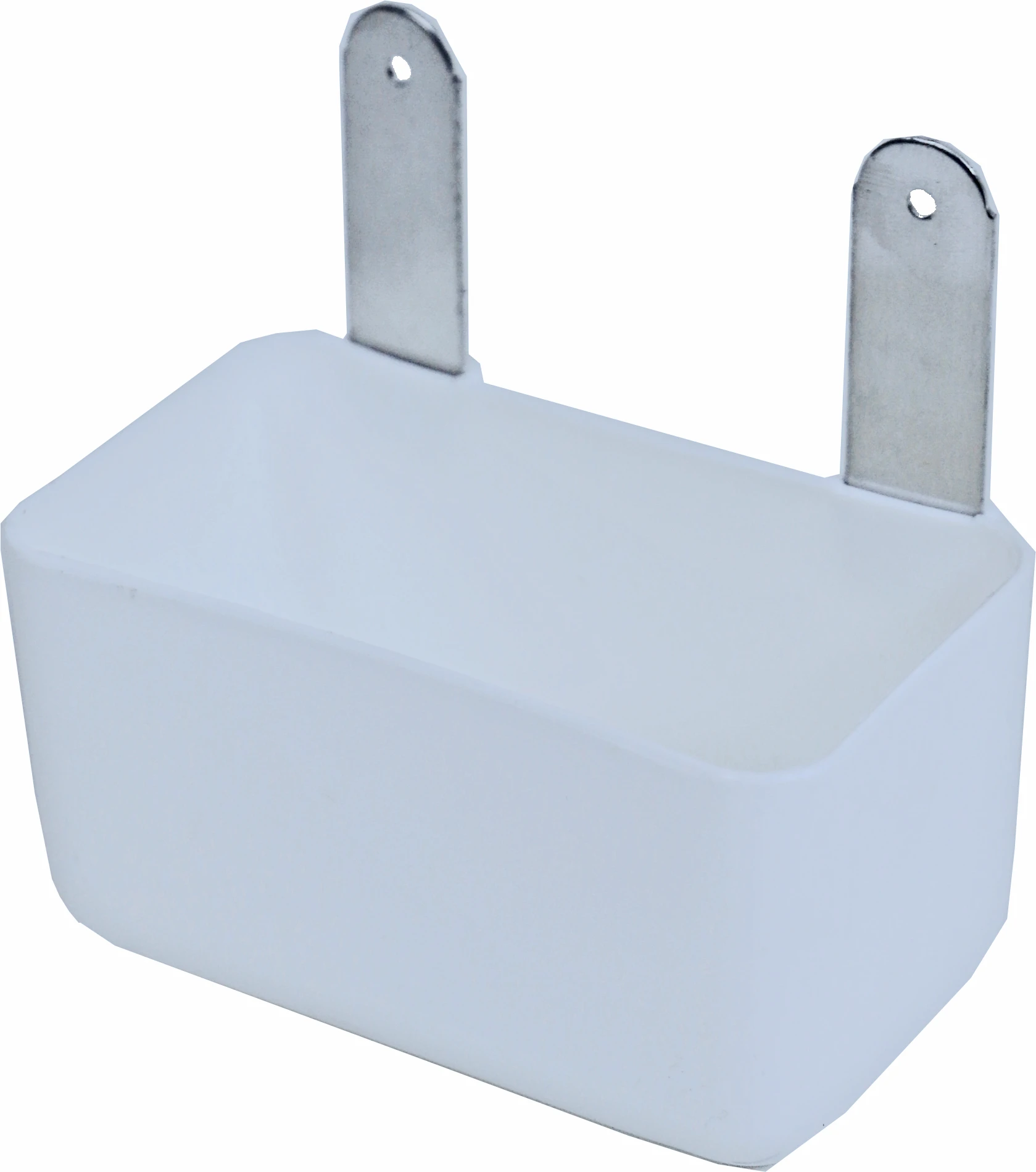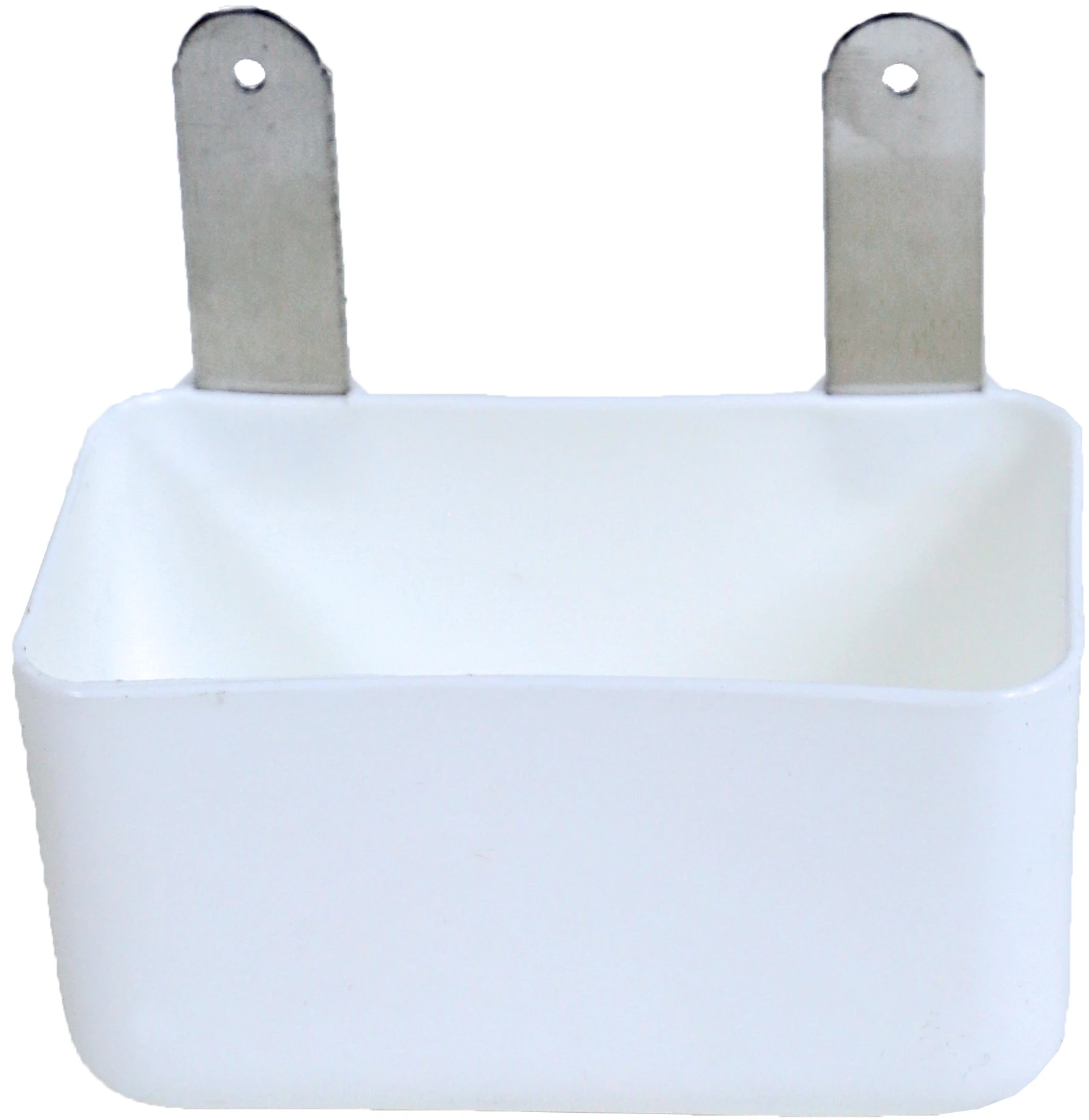 Weduwschapbakje wit met metalen lipjes . Het Weduwschapbakje is een plastic voer- of drinkbakje voor uw vogel(s). Dit bakje is gemaakt van plastic en is eenvoudig schoon te maken.