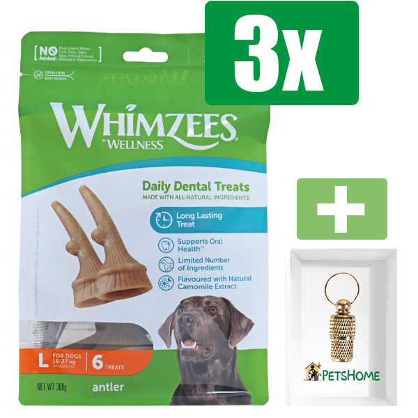 Whimzees Antler L – Kauwsnacks – Hond – 6st – 3 Zakken – Inclusief PetsHome Goudkleurige Adreskoker