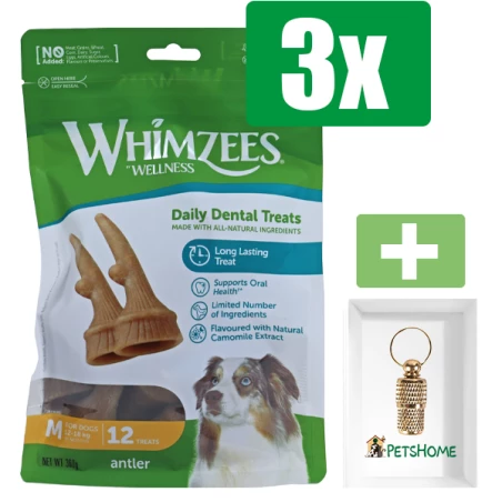 Whimzees Antler M – Kauwsnacks – Hond – 12st – 3 Zakken – Inclusief PetsHome Goudkleurige Adreskoker