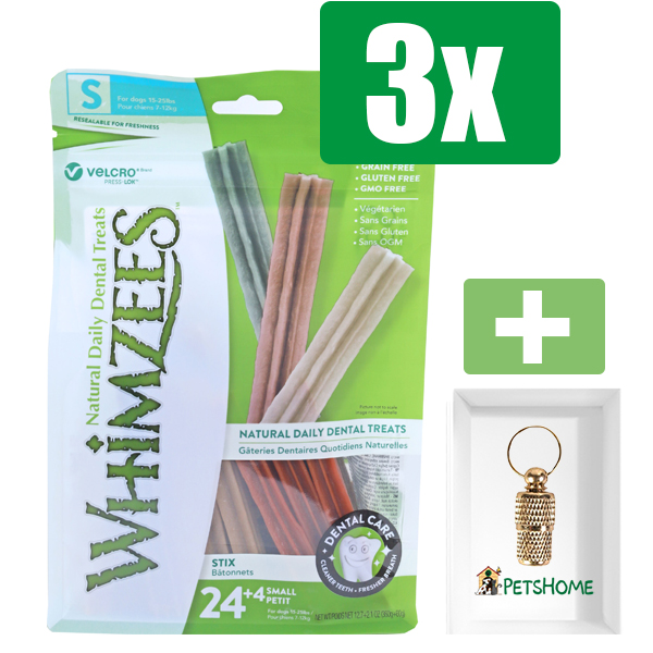 Whimzees Stix S – Kauwsnacks – Hond – 11,9cm – 24st – 3 Zakken – Inclusief PetsHome Goudkleurige Adreskoker