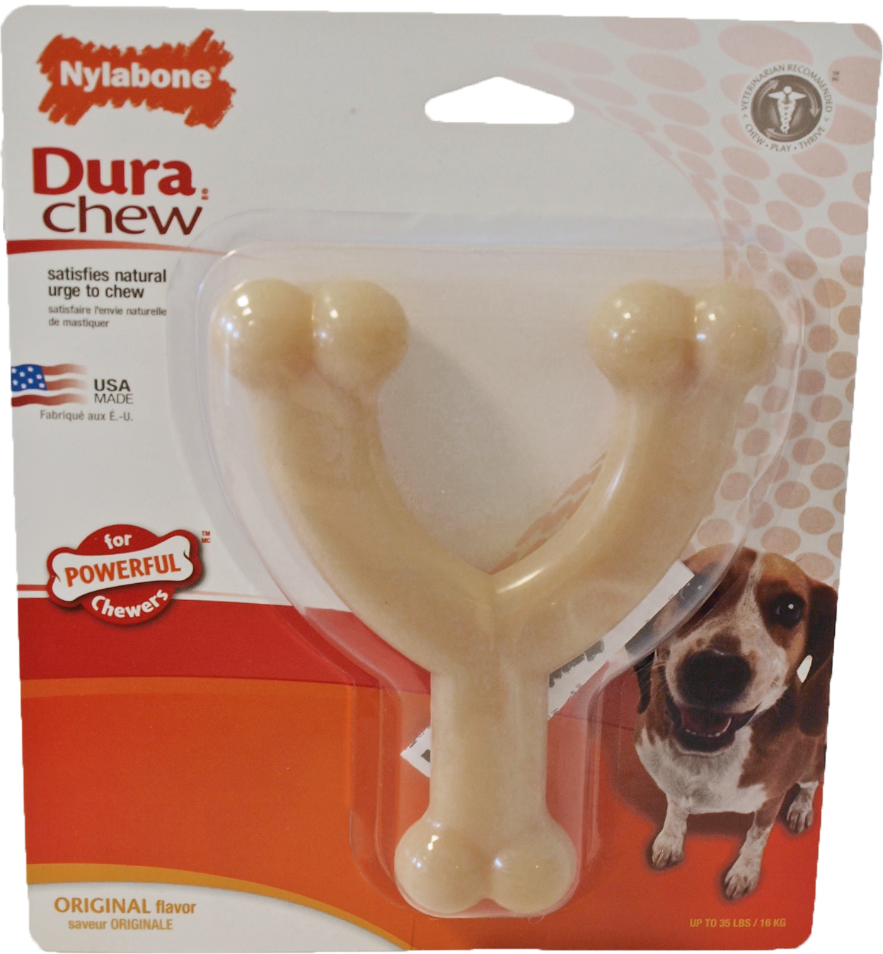 Nylabone Dura Chew whisbone original, geschikt voor volwassen honden tot ± 20 kg volwassen gewicht. Zij houden ervan op een hard materiaal te kauwen. Ideaal product voor kortsnuitige honden zoals de Franse Bulldog.
