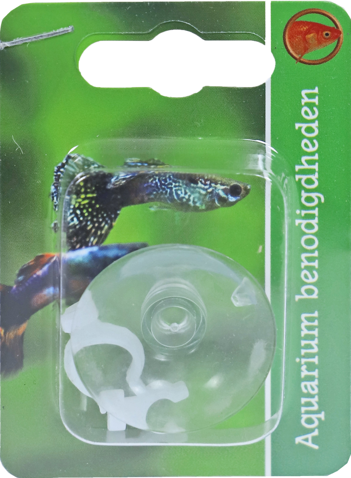 1 Zuignap met 2 klemmen. Selecteer een van de twee meegeleverde klemmen ( 4-6 mm of 9-12 mm) en bevestig deze in de zuiger. U kunt deze gebruiken voor het bevestigen van bijvoorbeeld slangen, verwarmers, thermometers op andere attributen op een gladde ondergrond. Geschikt voor zowel zoet- als zeewater.